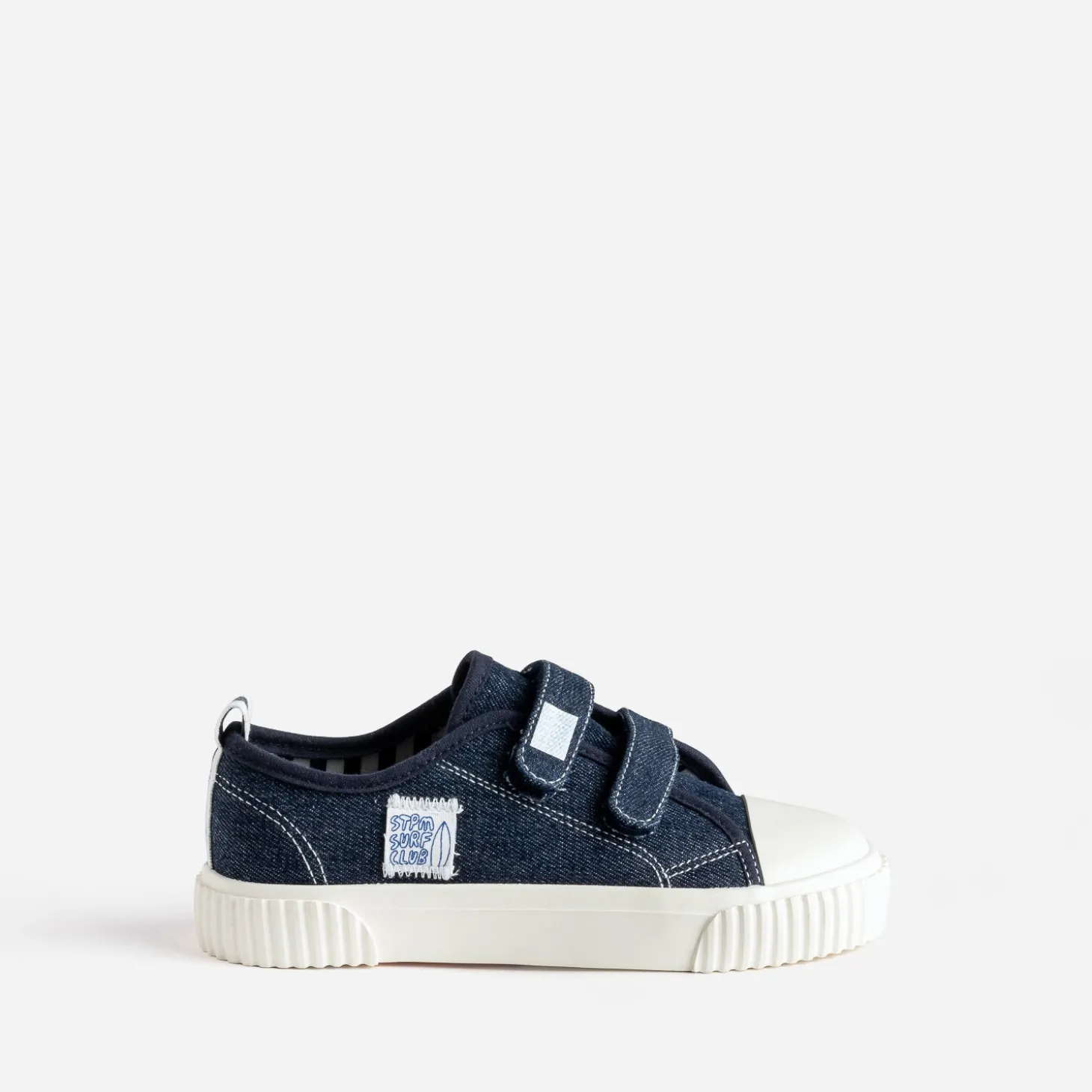 La tennis en toile qui matche avec tout, c’est la tennis inspiration denim brut. Fermée par double scratch, elle présente une doublure à motifs rayures, qui fait écho au galon placé sur le contrefort. Un modèle intemporel, idéal pour la mi-saison.