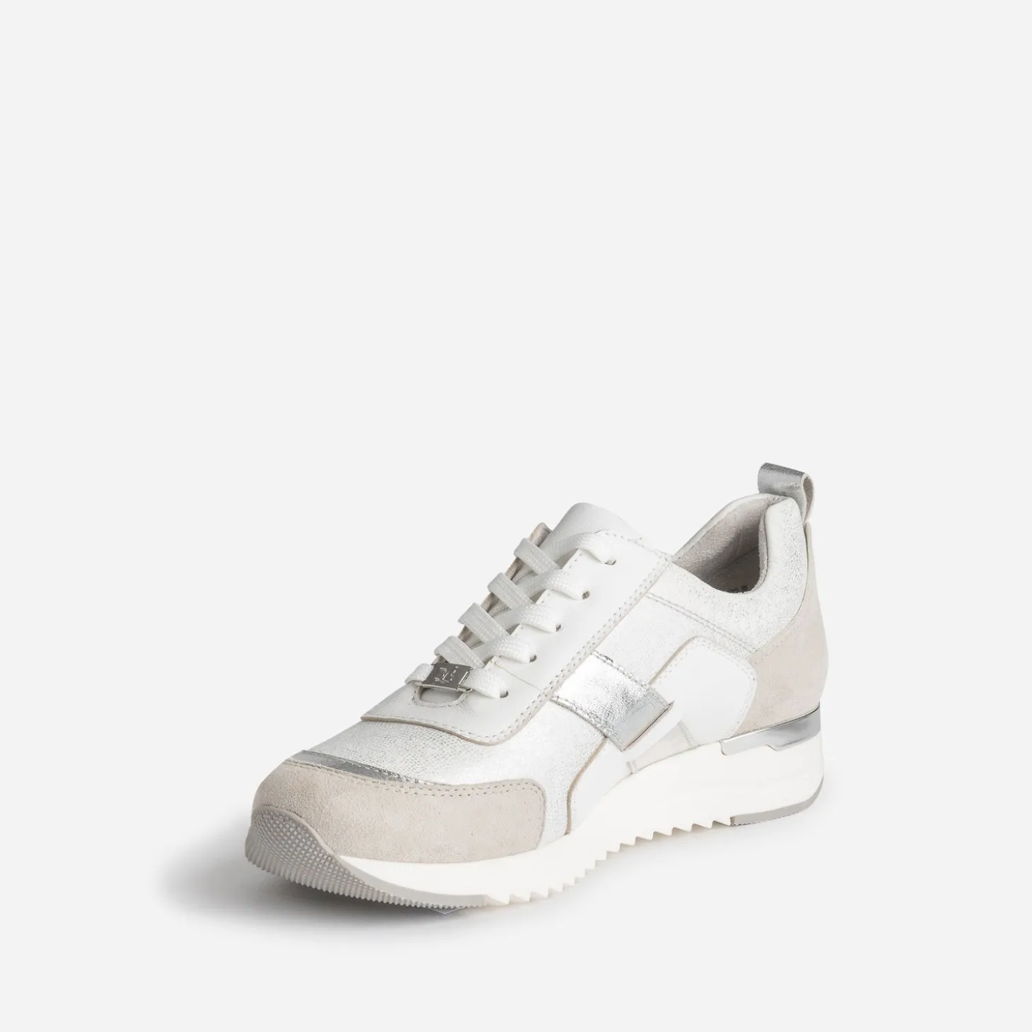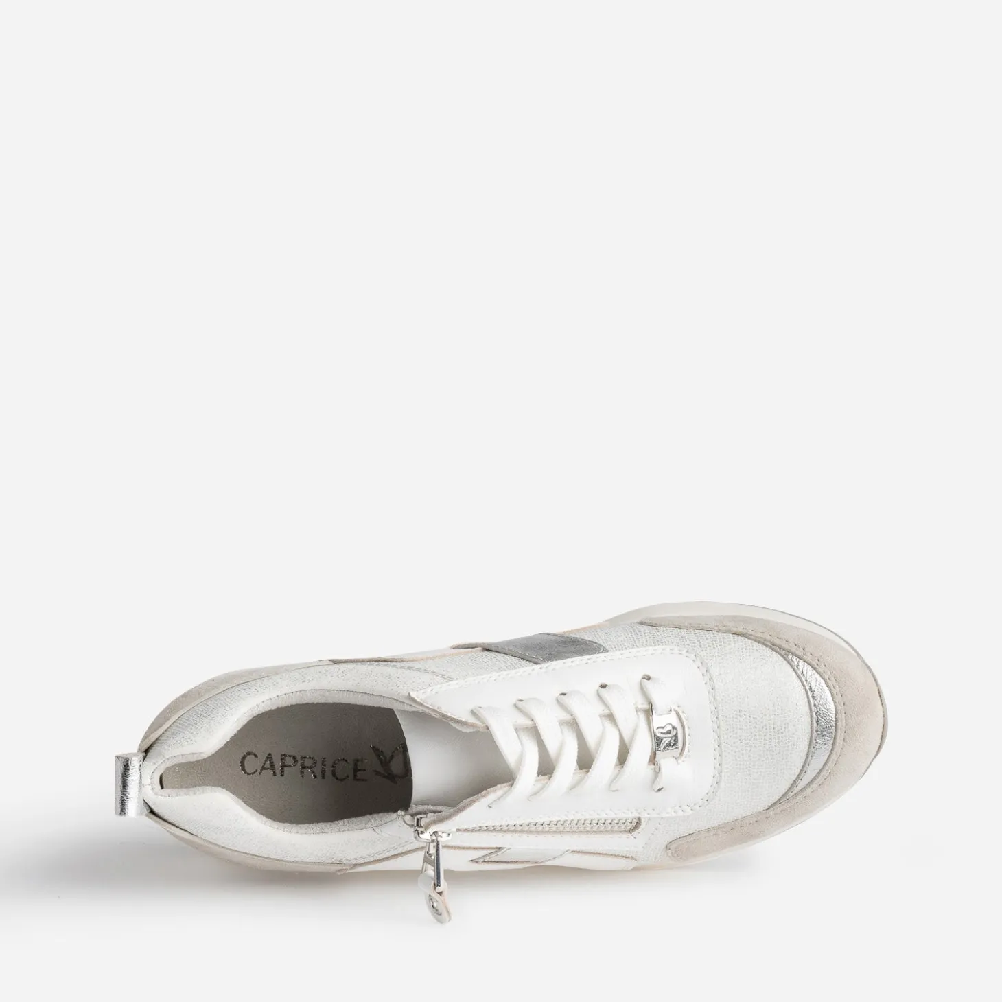 Le chausseur allemand CAPRICE réinvente le duo confort et style avec modernité. Cette tennis pour femme est un parfait exemple. En cuir et cuir velours, elle se décline en coloris blanc, rythmé de touches grises et d’un effet imprimé minimaliste argenté. Sa double fermeture, par lacet et zip côté, est un atout confort complémentaire. Un modèle à la pointe de la mode, qui va, en outre, alléger votre marche quotidienne.