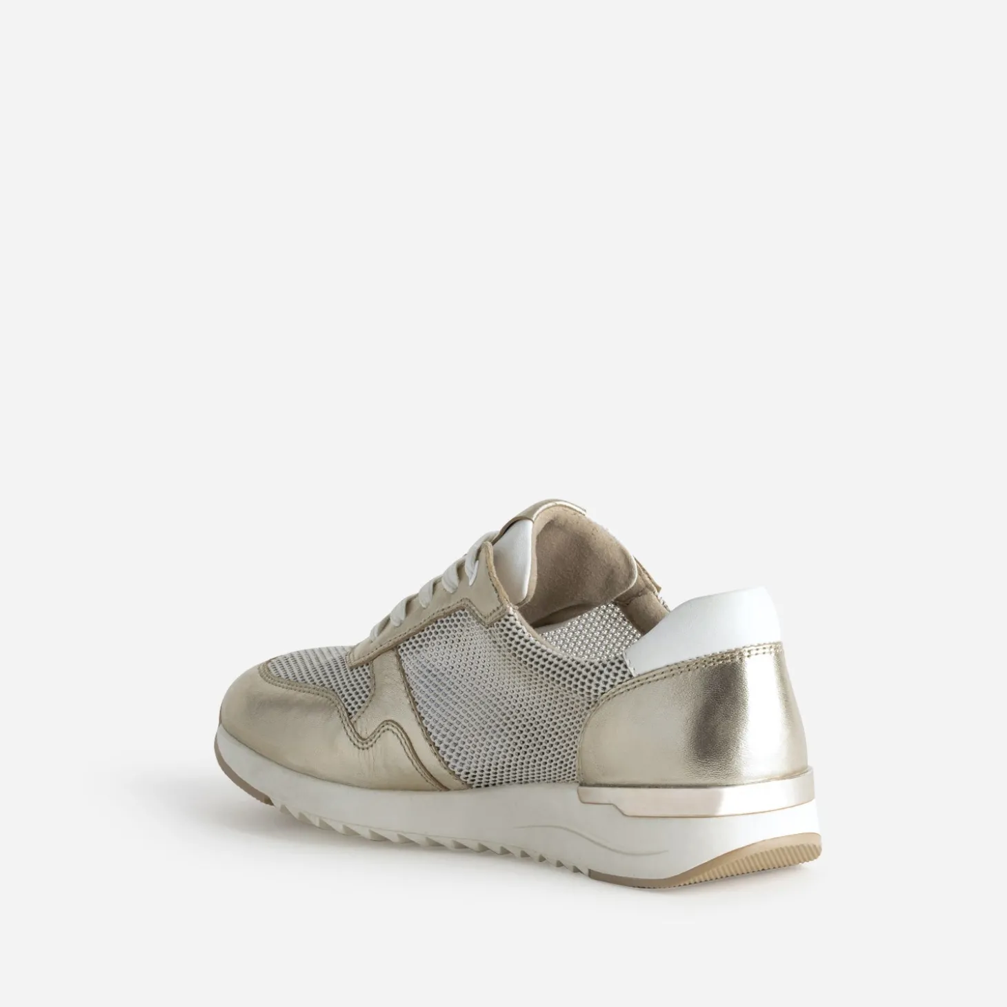 Légèreté, style, confort. Trois mots choisis avec soin pour décrire cette tennis femme. De couleur dorée, elle mixe les matières, cuir lisse et mesh, dans une belle harmonie. Son atout ? C’est sa semelle intérieure amovible, prévue pour accueillir une semelle plus adaptée si besoin. Un modèle à tester avec des teintes naturelles, du blanc au marron, ou pastel.