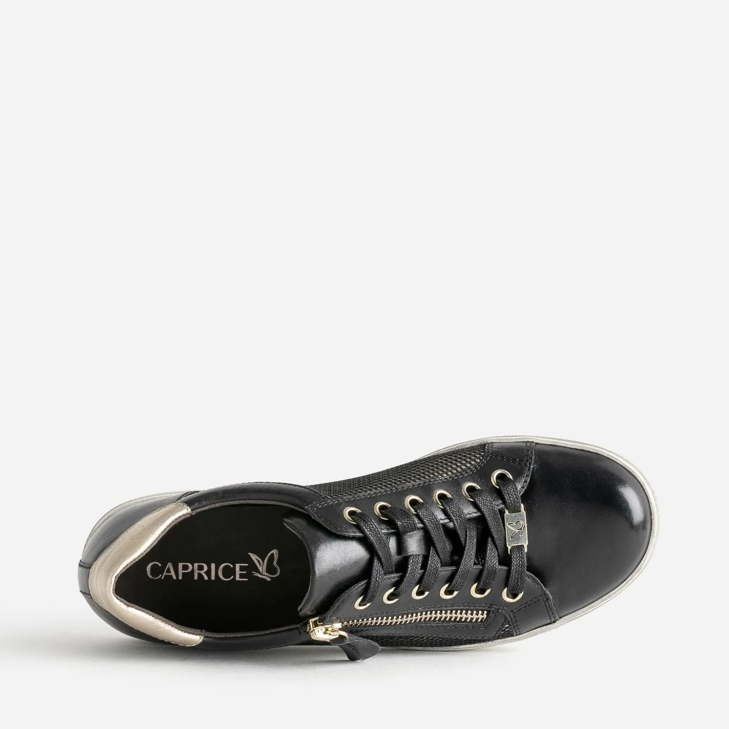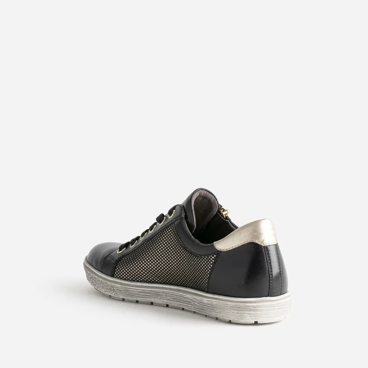 Cette nouvelle tennis dévoile une ligne simple, associant laçage et zip sur le côté. Laissez-vous séduire par son cuir noir ultra souple, animé d’un effet métallisé doré sous fine résille noire sur les quartiers et bronze sur le contrefort. La semelle première en cuir est dotée de la technologie ‘onAIR’, garantissant un meilleur amorti et une aération optimale de la chaussure.