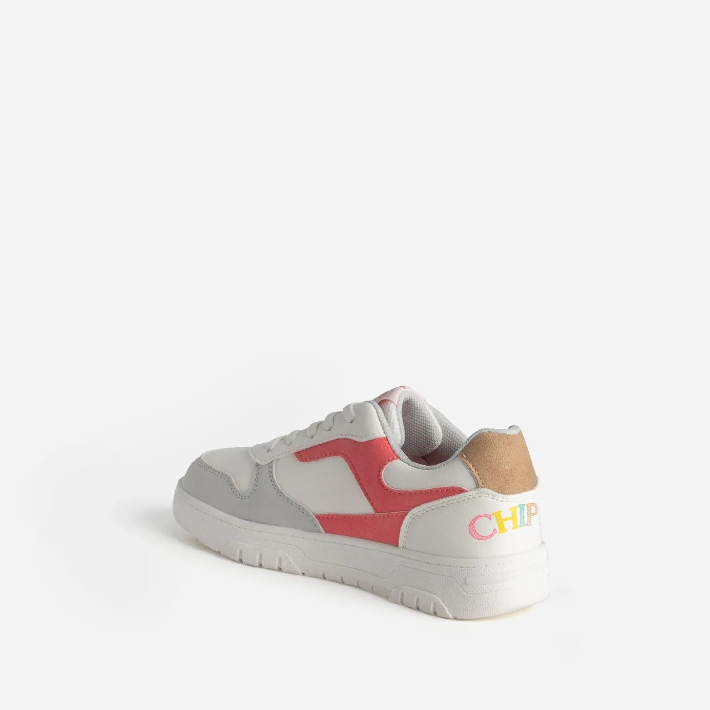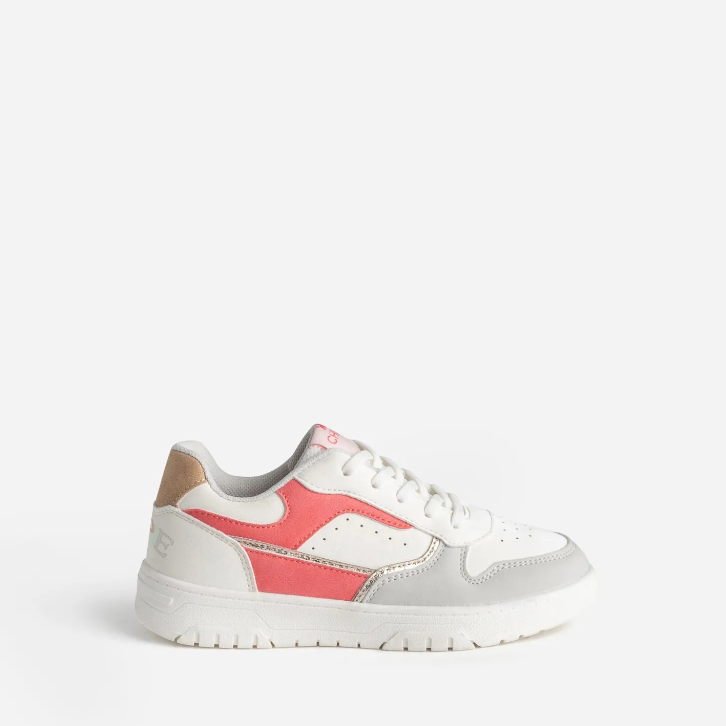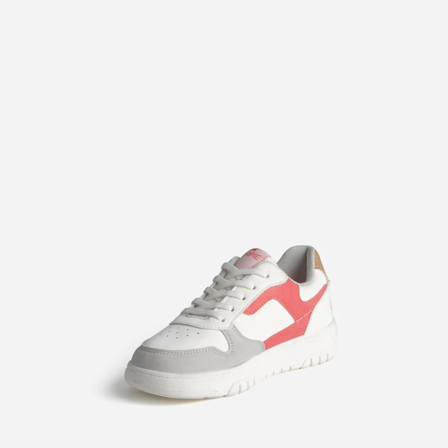Esprit sportswear pour cette tennis basse pour fille. En matière synthétique, elle est rythmé de découpes dans les coloris écru, gris clair, rose moyen et camel dans une belle harmonie. Le logo version multico habille le contrefort.