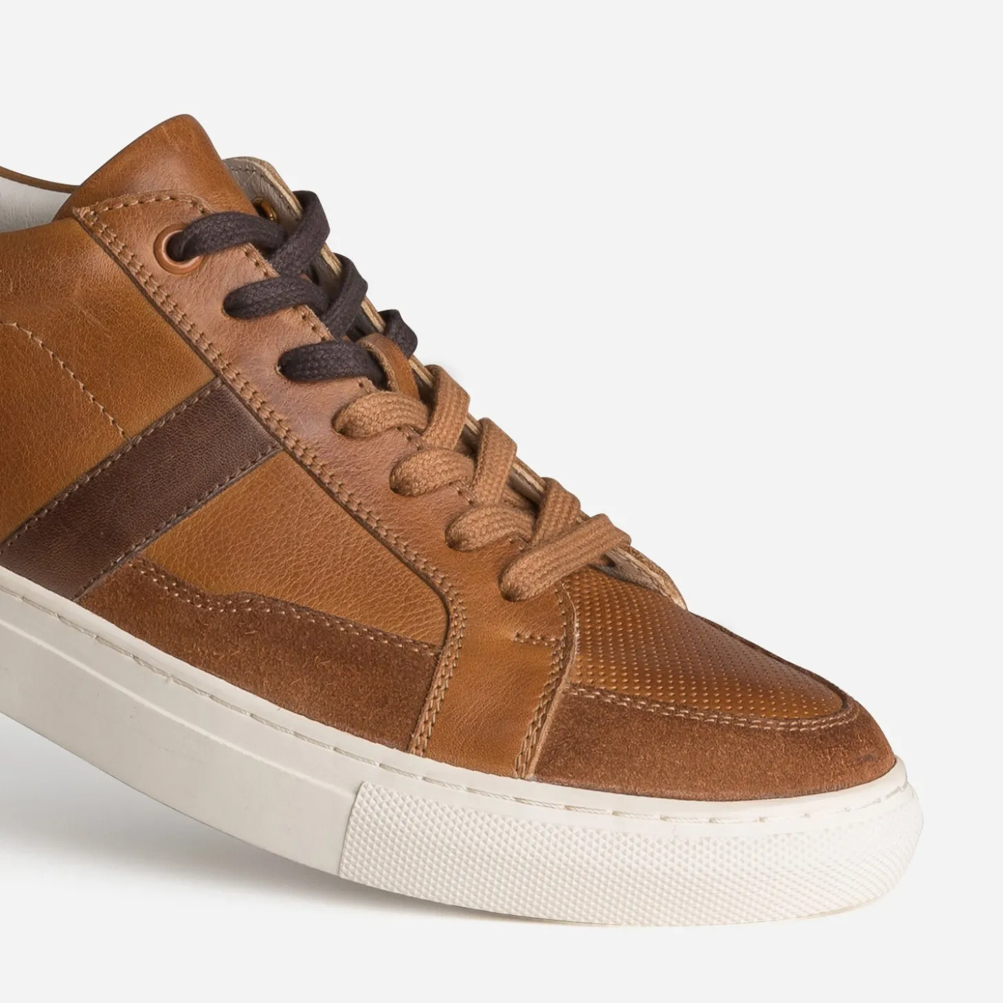 Cuir lisse, cuir velours, cuir embossé : la tennis pour homme maîtrise les découpes placées dans une harmonie étudiée. Déclinée dans un camaïeu autour du cognac, elle est livrée avec deux paires de lacets, l’un ton sur ton, l’autre marron foncé. Un modèle à privilégier avec du blanc, du bleu ou du kaki.