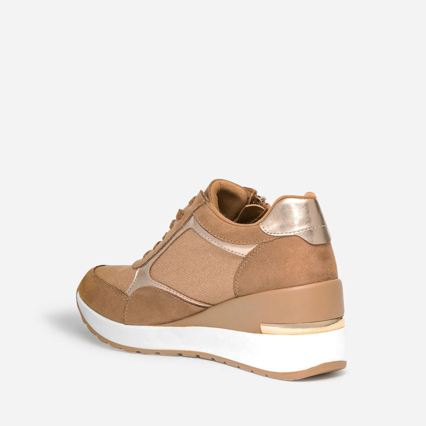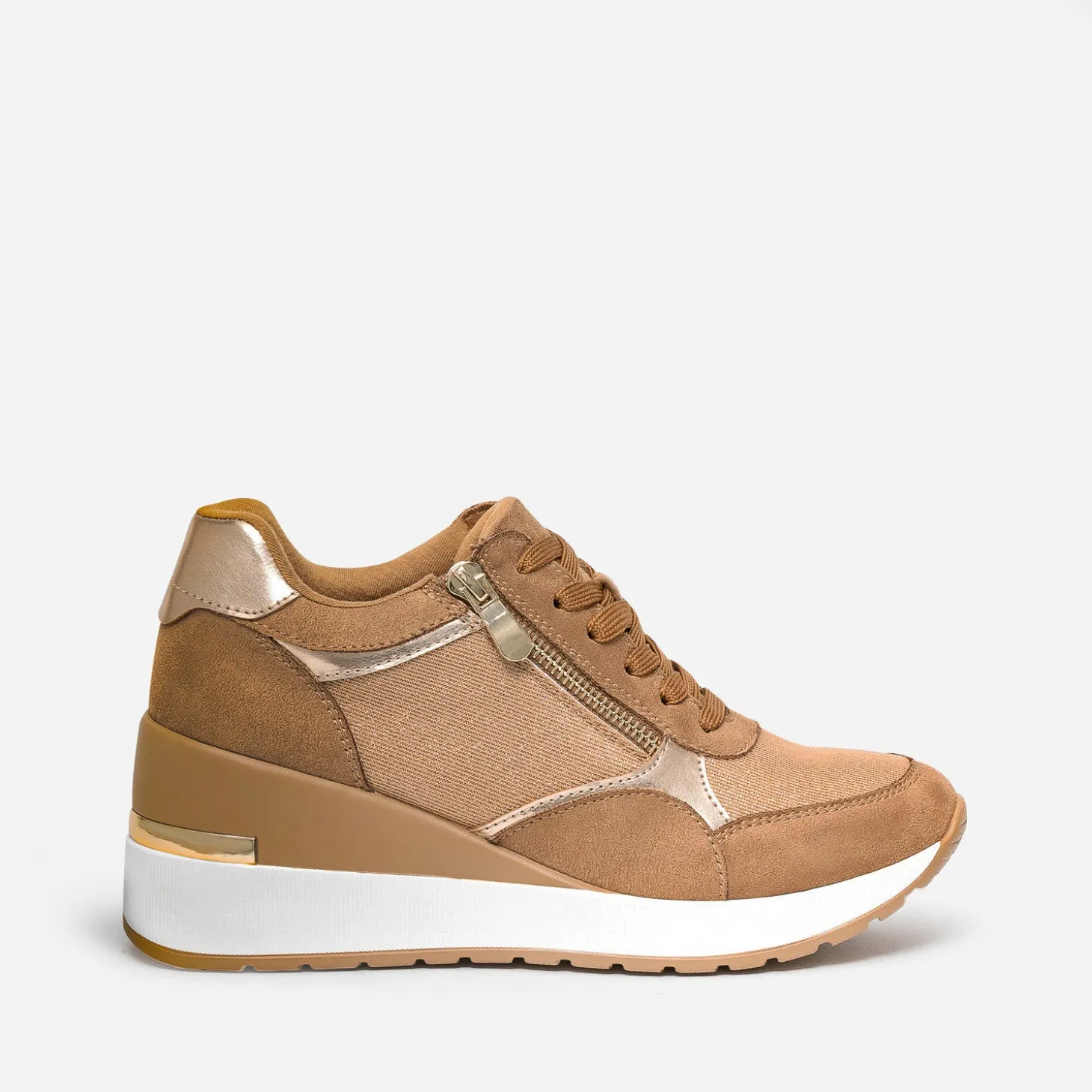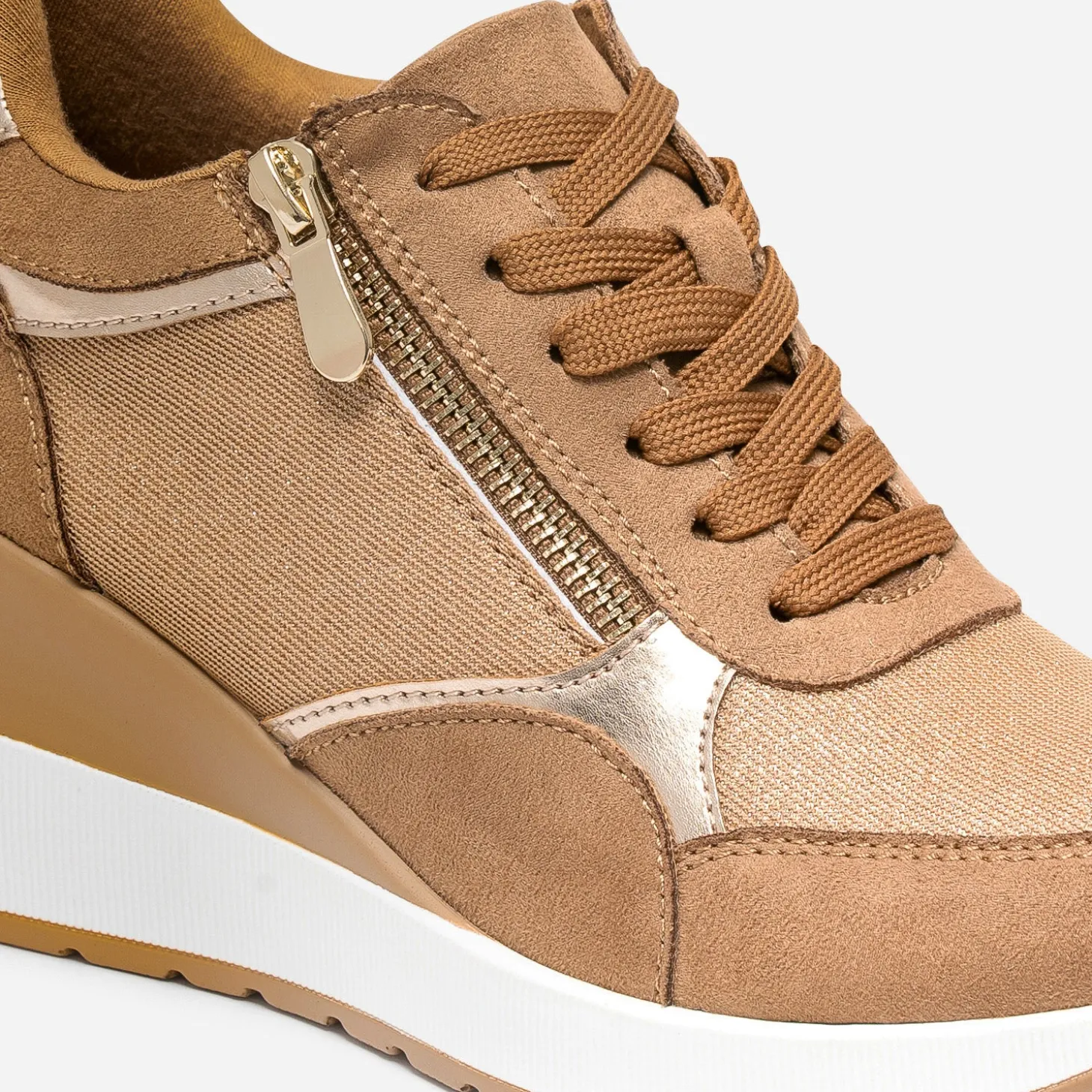 Prendre de la hauteur, même en tennis ? C’est possible avec ce modèle pour femme. Montée sur une semelle compensée de plus de 7 cm, cette basket basse bouscule les codes. Coloris camel, elle maîtrise le mélange de matières à la perfection : matières synthétiques, suédée ou vernie, et mesh pailleté. Le zip extérieur apporte du chic en s’accordant à la baguette dorée placée sur le contrefort. Essayez-la avec un tee-shirt blanc et un pantalon large de couleur foncé.