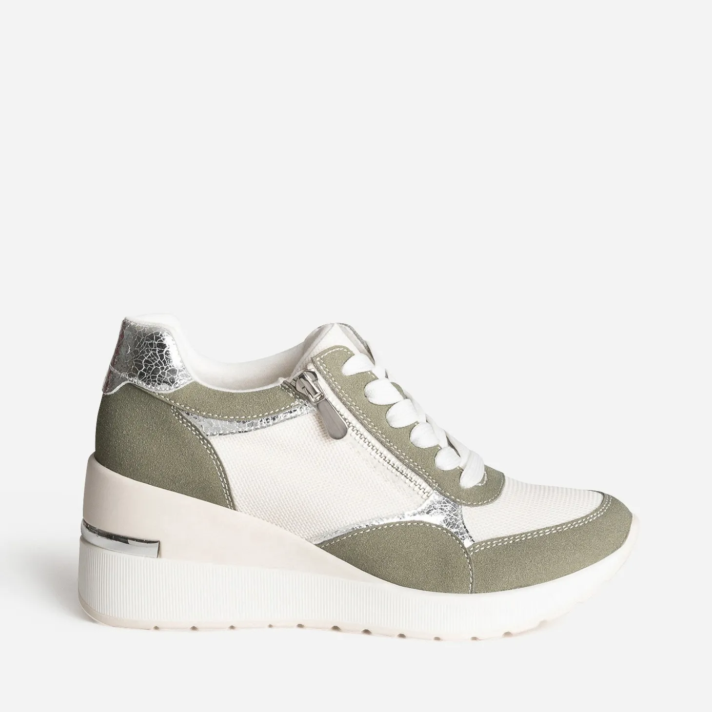 Prendre de la hauteur, même en tennis ? C’est possible avec ce modèle pour femme. Montée sur une semelle compensée de plus de 7 cm, cette basket basse bouscule les codes. Coloris kaki, blanc et argenté, elle maîtrise le mélange de matières à la perfection : matières synthétiques, suédée ou métallisée, et mesh. Le zip extérieur apporte du chic en s’accordant à la baguette argentée placée sur le contrefort. Essayez-la avec un tee-shirt blanc et un pantalon large de couleur grise.