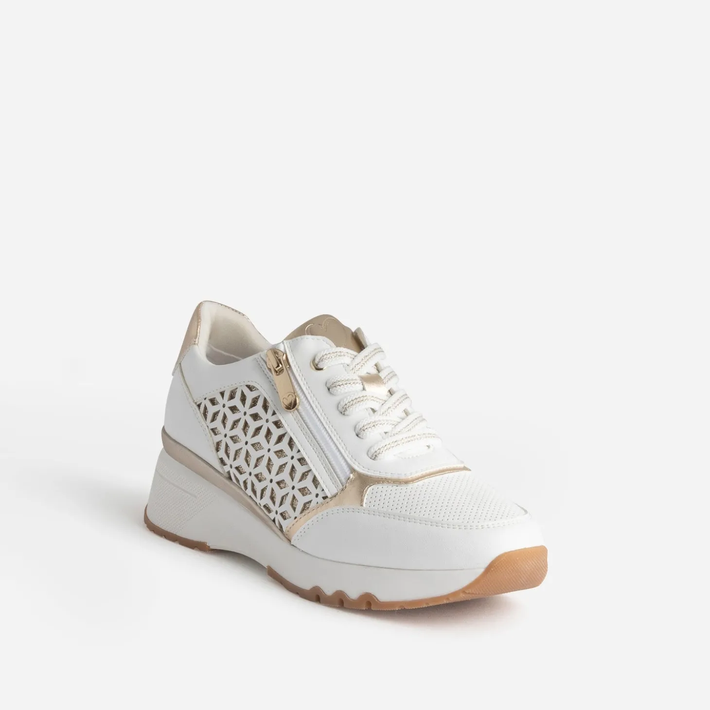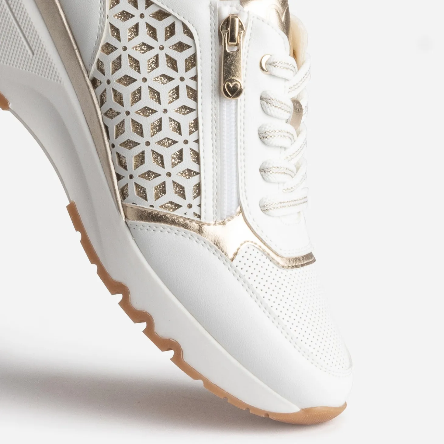 C’est la nouvelle forme de tennis compensée à ne pas manquer cette saison. Mix d’écru et de doré sur une matière synthétique lisse, elle se laisse rythmer de motifs graphiques ajourés sur les côtés et se ferme par lacet et zip latéral. La semelle première est amovible, pour accueillir votre semelle orthopédique adaptée. Alliez confort et mode, sans modération.