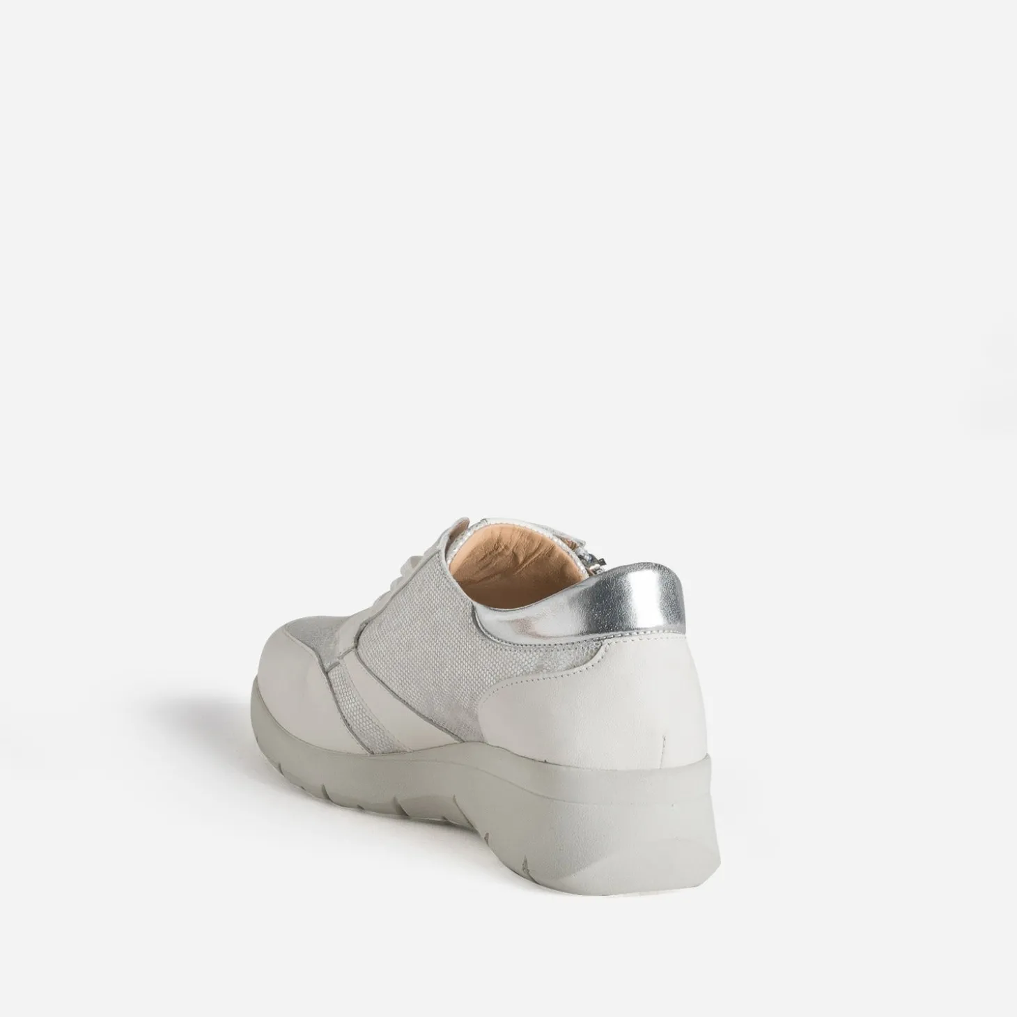 Cette tennis pour femme est une promesse de confort durable. Confectionnée en cuir lisse, elle se décline en coloris blanc et se démarque par un effet léopard gris argenté sur le dessus et les côtés de la tige, en accord avec la languette. Elle se ferme par un lacet et un zip latéral. Montée sur une semelle légèrement compensée, elle promet un confort incomparable, au quotidien.