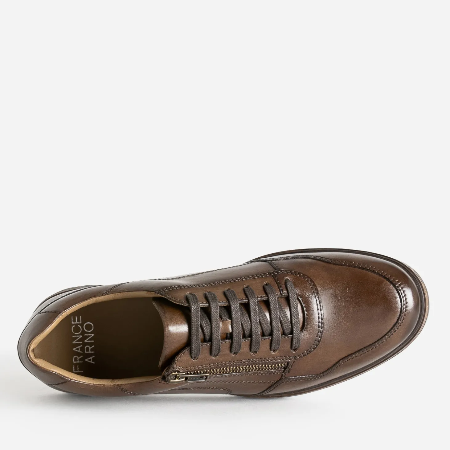 Tige basse et tout cuir, la tennis homme se réinvente, sans compromettre son confort. Coloris marron, il est rythmé de découpes, se ferme par un lacet et un zip côté. Un modèle facile à porter, au quotidien.