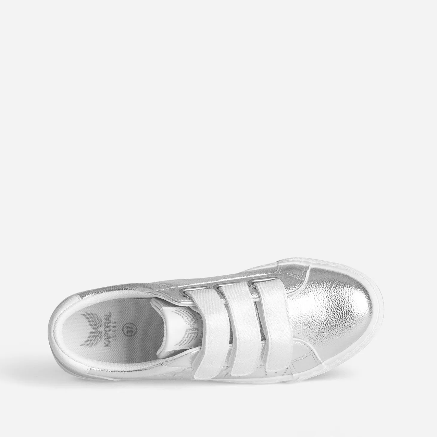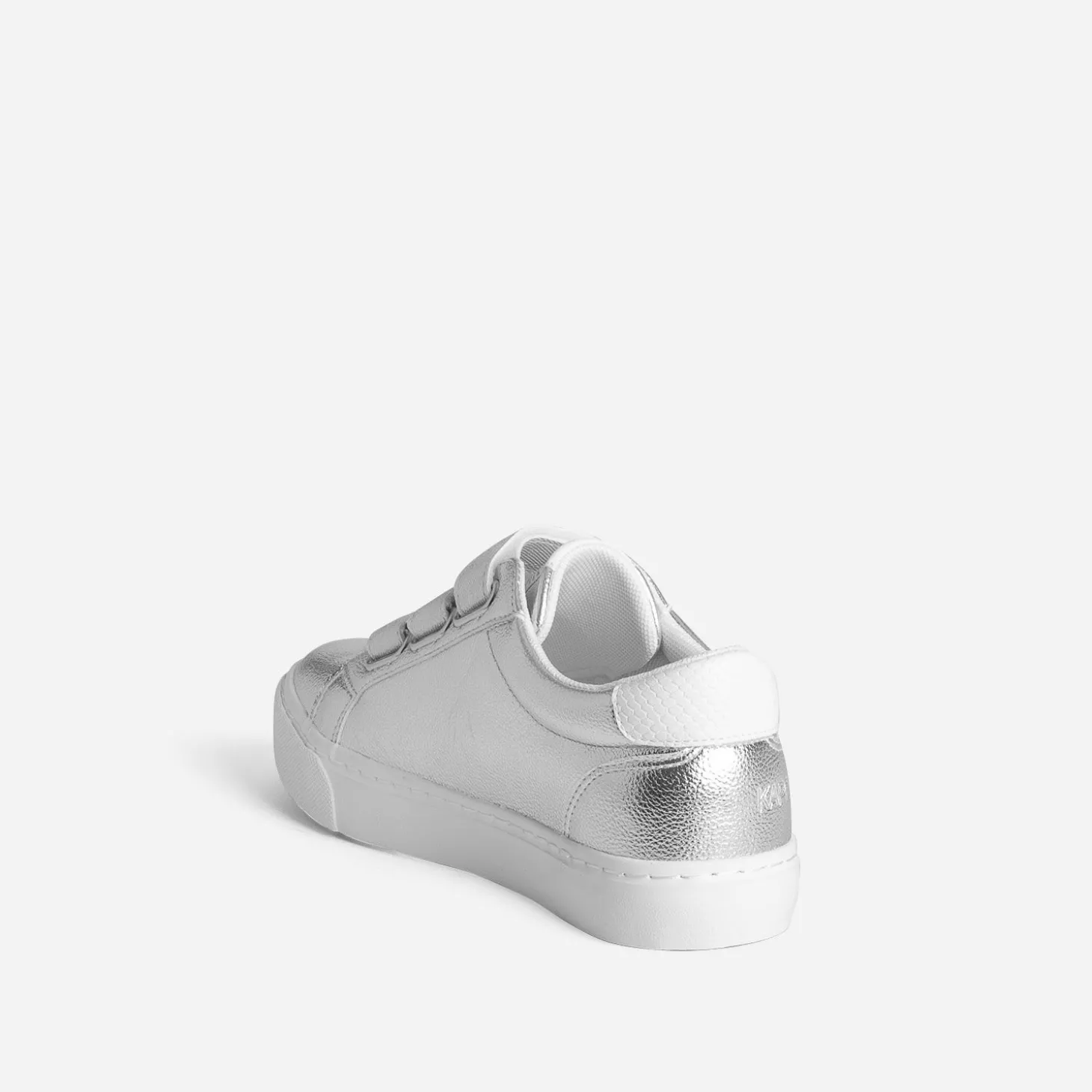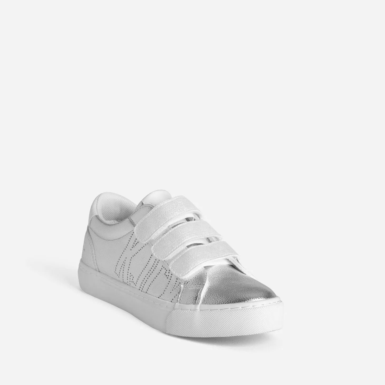 Envie d’une touche de brillance au quotidien ? Craquez pour la tennis. En matière synthétique lisse argentée, elle démarque par un maxi logo KJ, joué par perforations, sur le côté, et un contrefort blanc embossé effet python. Elle se ferme par trois scratchs en textile irisé, en écho au logo sur l’étiquette tissée, posée sur la languette. Un modèle très fashion, aussi à l’aise avec un tee-shirt et un jean, qu’avec une jupe longue plissée ou un costume dans des tons froids (bleu, vert, gris, violet).