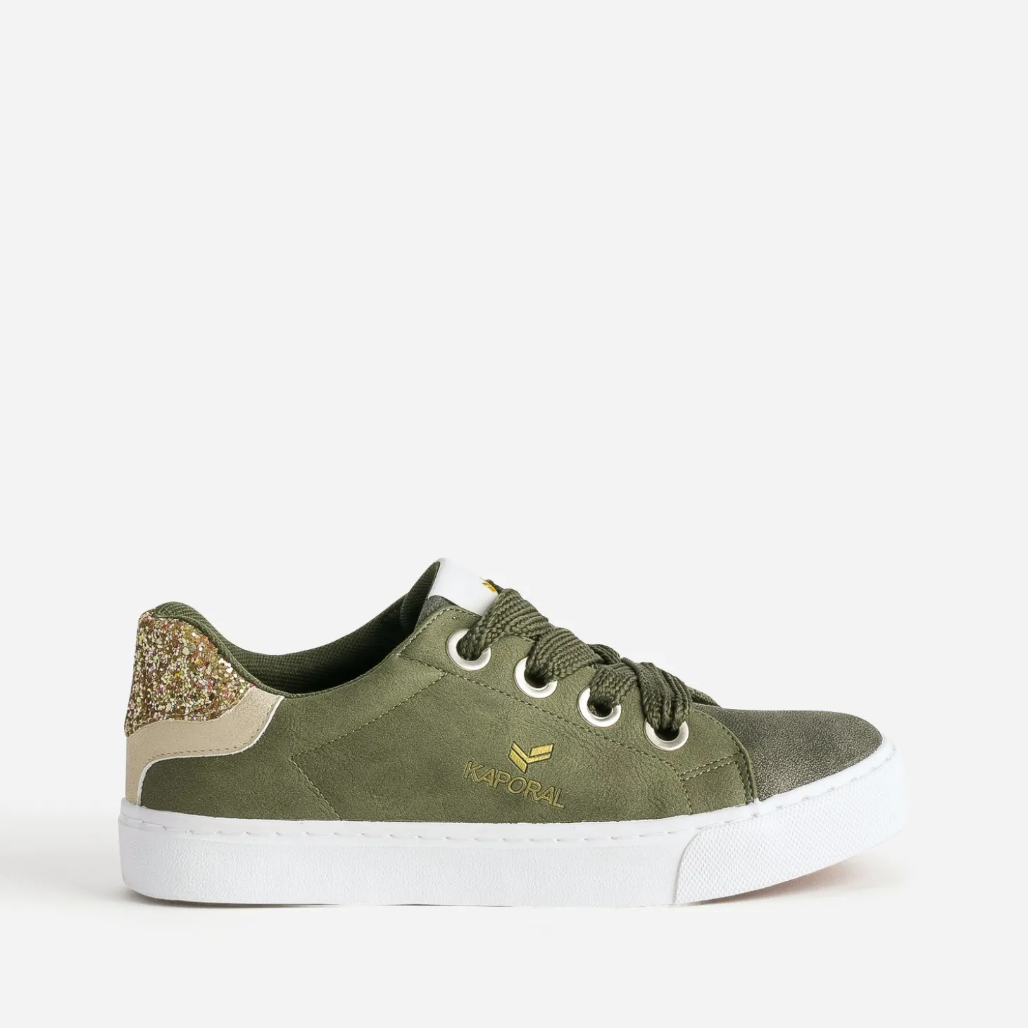 Côtés lisses, dessus et languette légèrement texturés, contrefort pailleté, le tout en matière synthétique, doublure et première 100% textile, cette tennis pour femme est un parfait équilibre entre mode et confort. Déclinée en coloris kaki, elle se démarque par ses 2 paires de lacets, 1 version ruban satiné imprimé et 1 large ton sur ton. Un modèle facile à adapter à votre look ou votre humeur du moment.