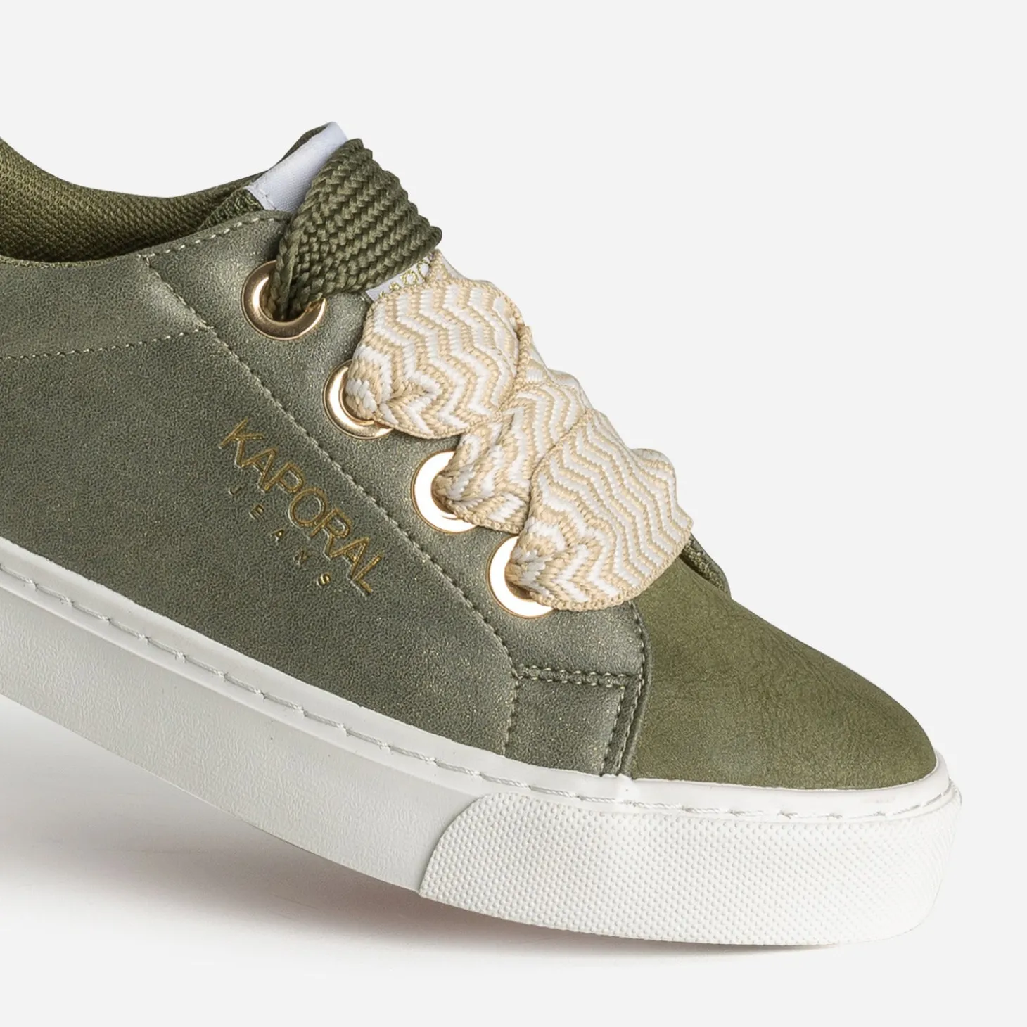 Bout du pied et languette lisses, tige légèrement irisée, contrefort métallisé doré, le tout en matière synthétique, doublure et première 100% textile, cette tennis pour femme est un parfait équilibre entre mode et confort. Déclinée en coloris kaki, elle est livrée avec deux paires de lacets, un à motif chevrons beige et blanc et un ton sur ton. Un modèle facile à adapter à votre look ou votre humeur du moment.
