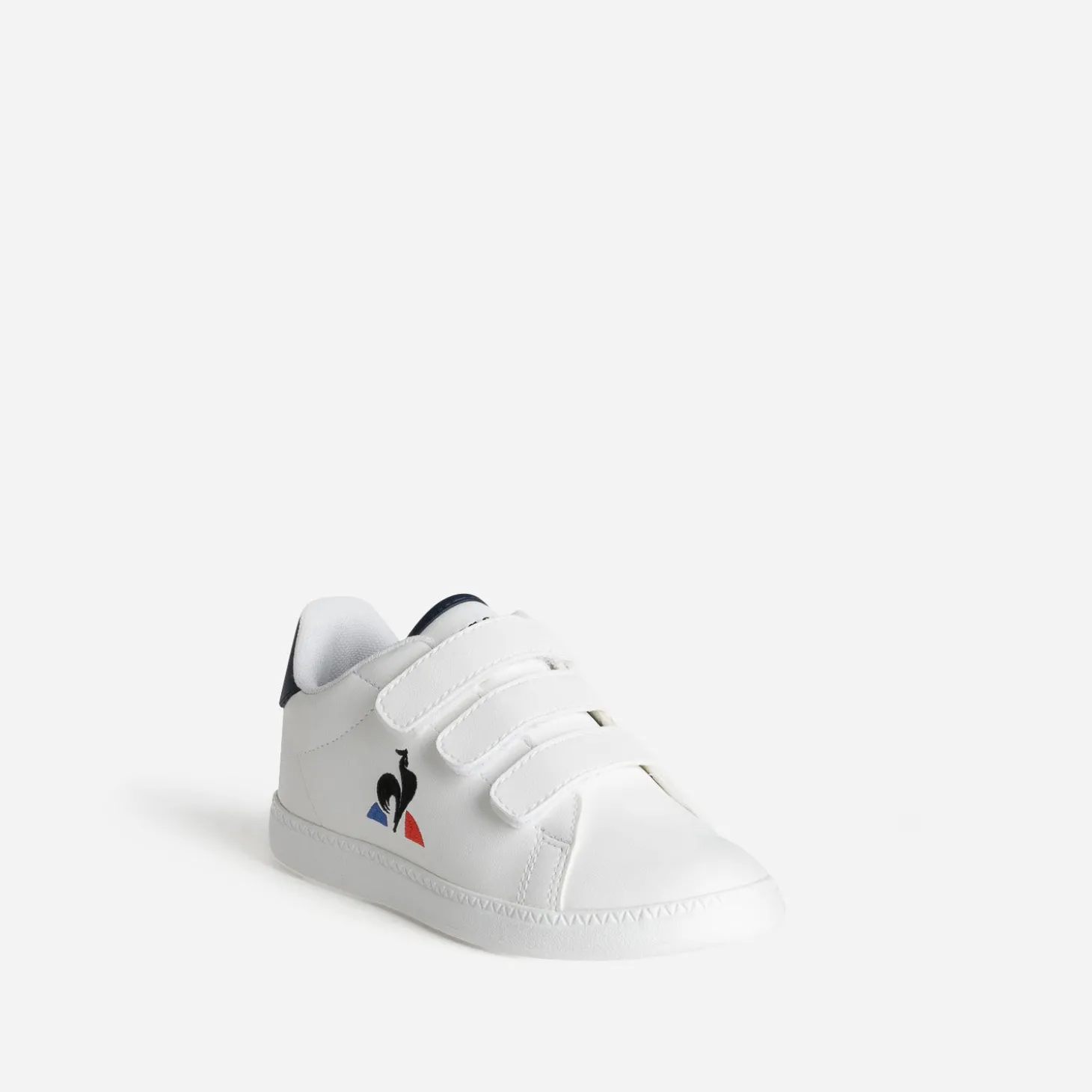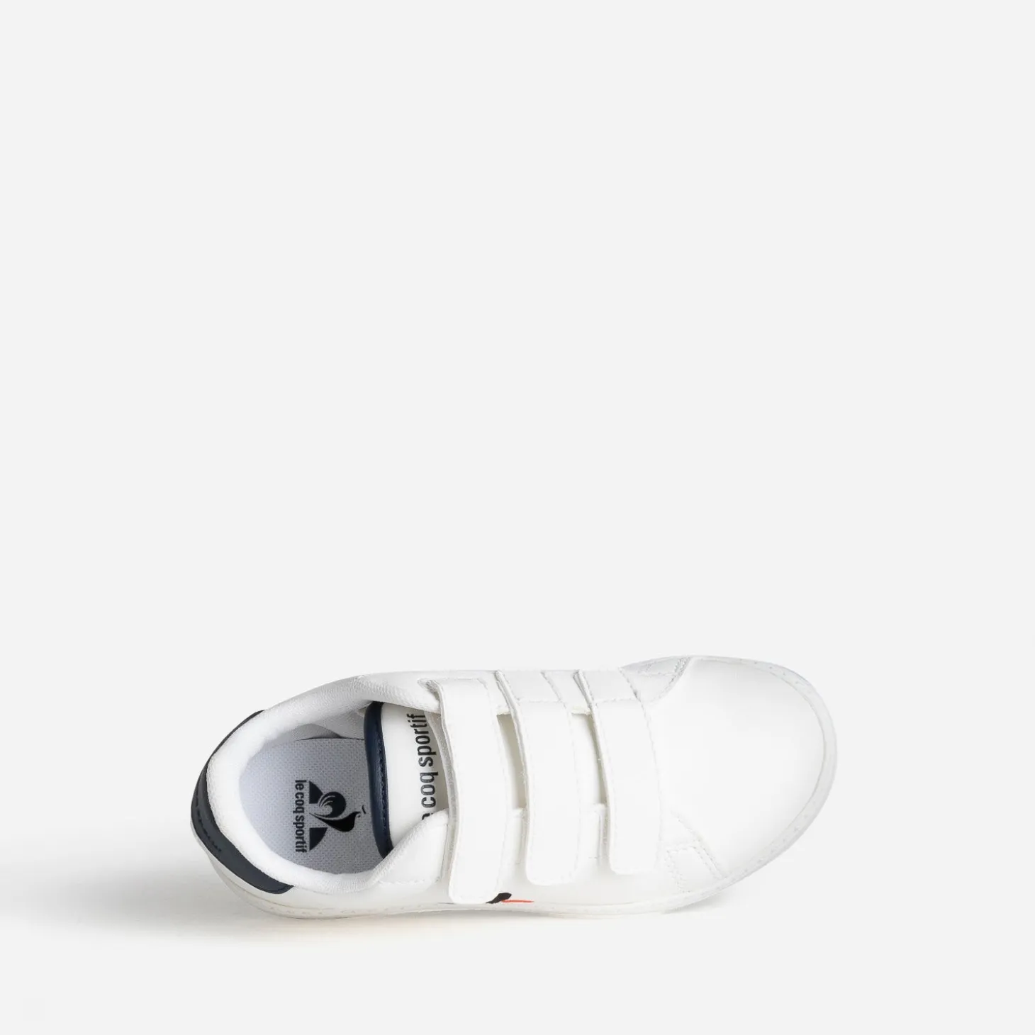 Style ? Confort ? Prenez les deux ! Cette tennis pour enfant en matière synthétique lisse se décline en coloris blanc, rehaussé de touches de bleu marine sur le bord de la languette et le contrefort. Le logo du côté s’autorise une broderie tricolore. La semelle intérieure amovible à mémoire de forme est issue de la technologie Comfort Feel®, pour un confort optimal et un amorti sur mesure. La fermeture par scratchs permet un maniement facile par les petites mains. Un modèle idéal, pour les jeunes (futurs) champions qui aiment les défis. <br