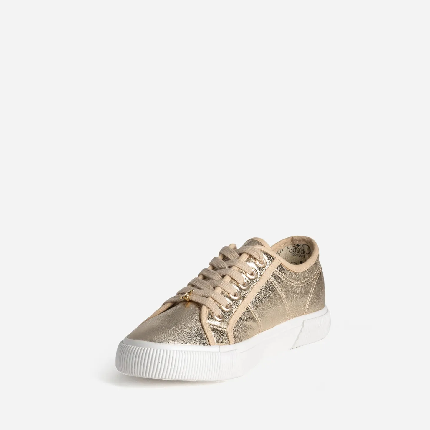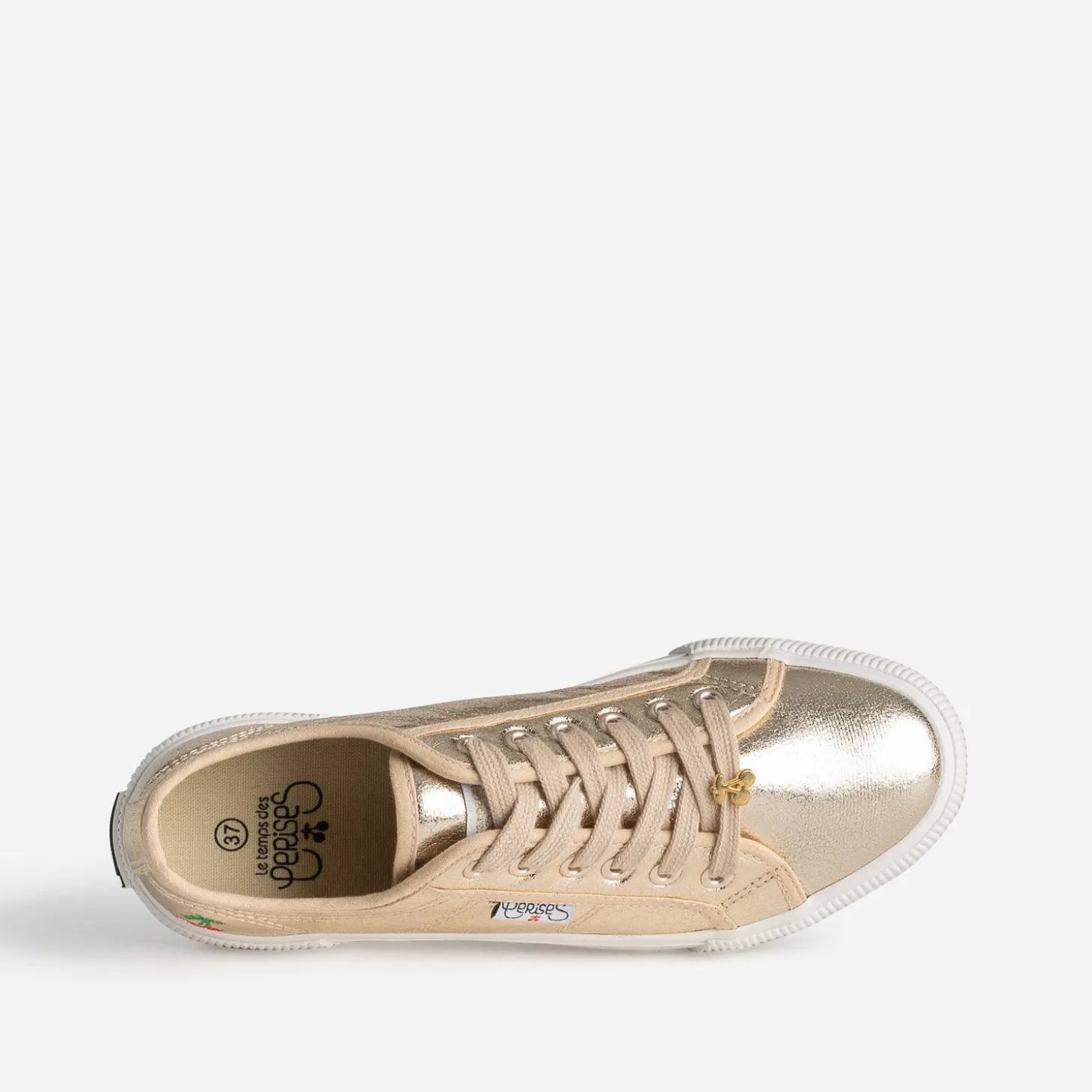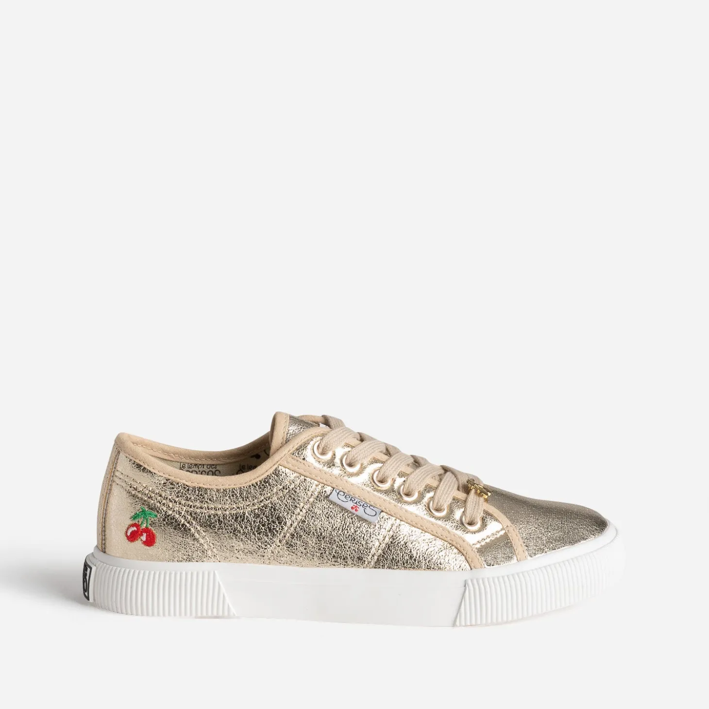 Cette tennis est un classique de la marque. En toile dorée unie, elle est rythmée de découpes et décorée d’un charm’ cerises en métal jaune glissé sur le lacet. La doublure intérieure accueille un marquage logos noirs, la languette, une étiquette tissée, et le talon, une broderie cerises. Une basket basse pour femme, qui affirme sa différence.