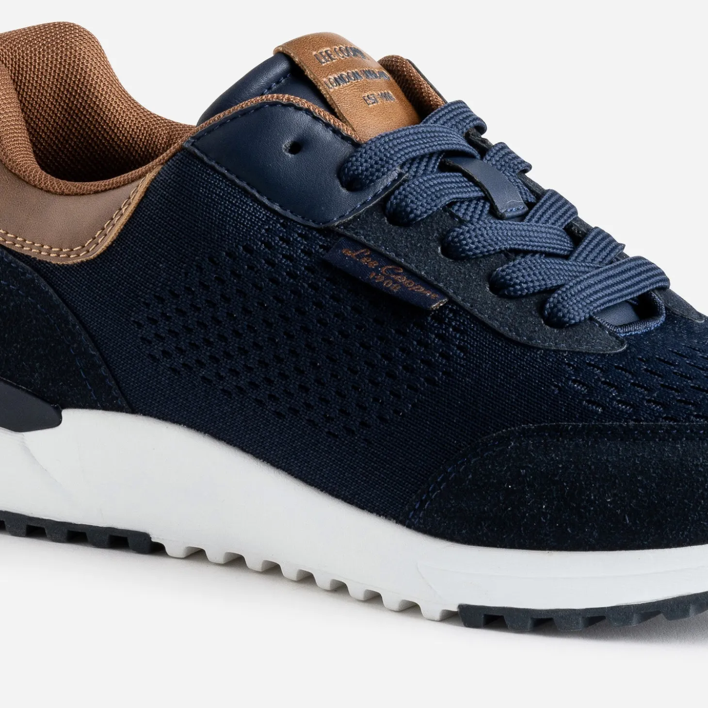 Mix matières alliant mesh tricoté et matière synthétique suédée bleu marine, cette tennis homme se laisse bousculer par des détails marron sur le contrefort, la tige et la languette. Un modèle à lacet, à réserver aux looks décontractés.