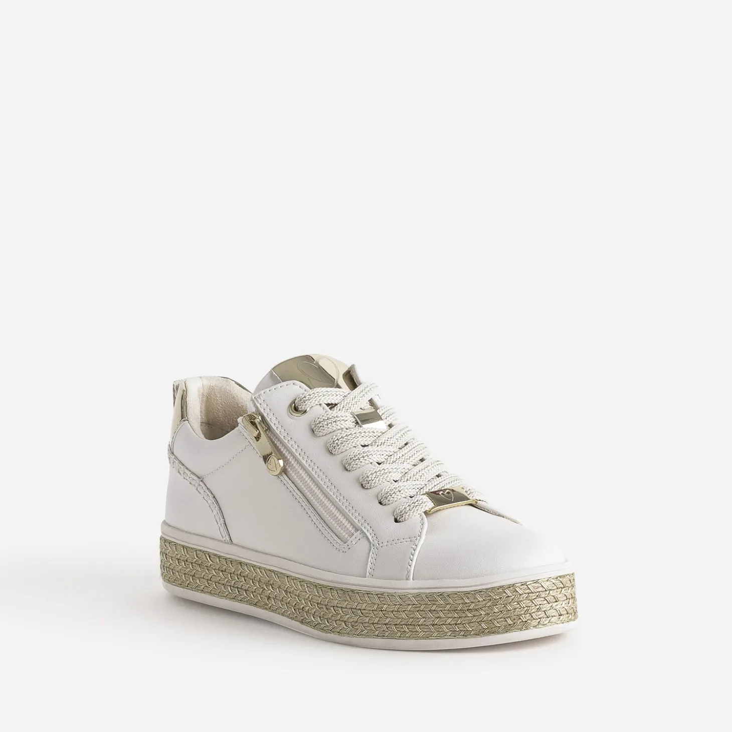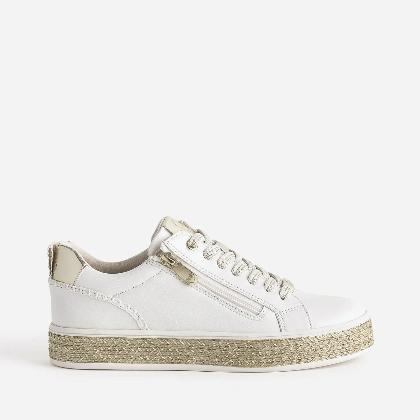 Nouveau design pour la tennis femme. Confectionnée en matière synthétique, elle se décline en coloris beige mat, idéal pour une transition de saison en douceur. Sa singularité, c’est sa semelle, bordée de cordes avec fils dorés, en écho aux métalleries et au contrefort. A l’intérieur, la semelle première amovible permet d’accueillir votre semelle orthopédique pour toujours plus de confort. Le lacet pailleté est doublé par un zip sur le côté, pour faciliter l’entrée et la sortie du pied. Associez-la avec des tons blancs ou kaki.