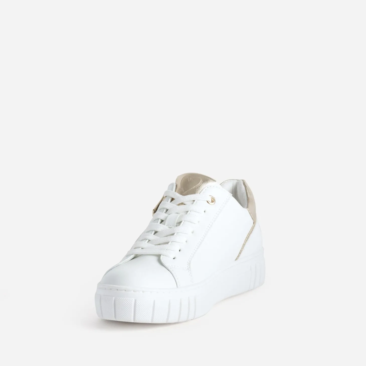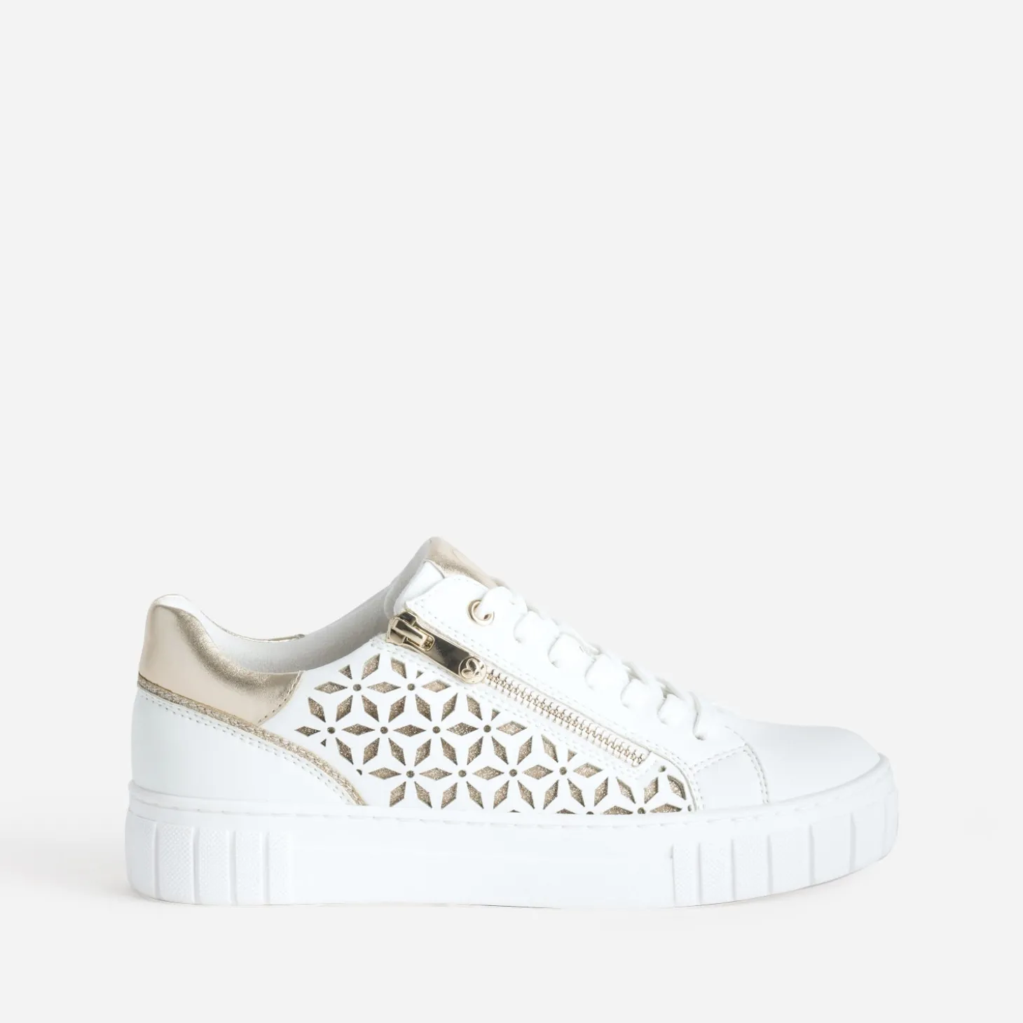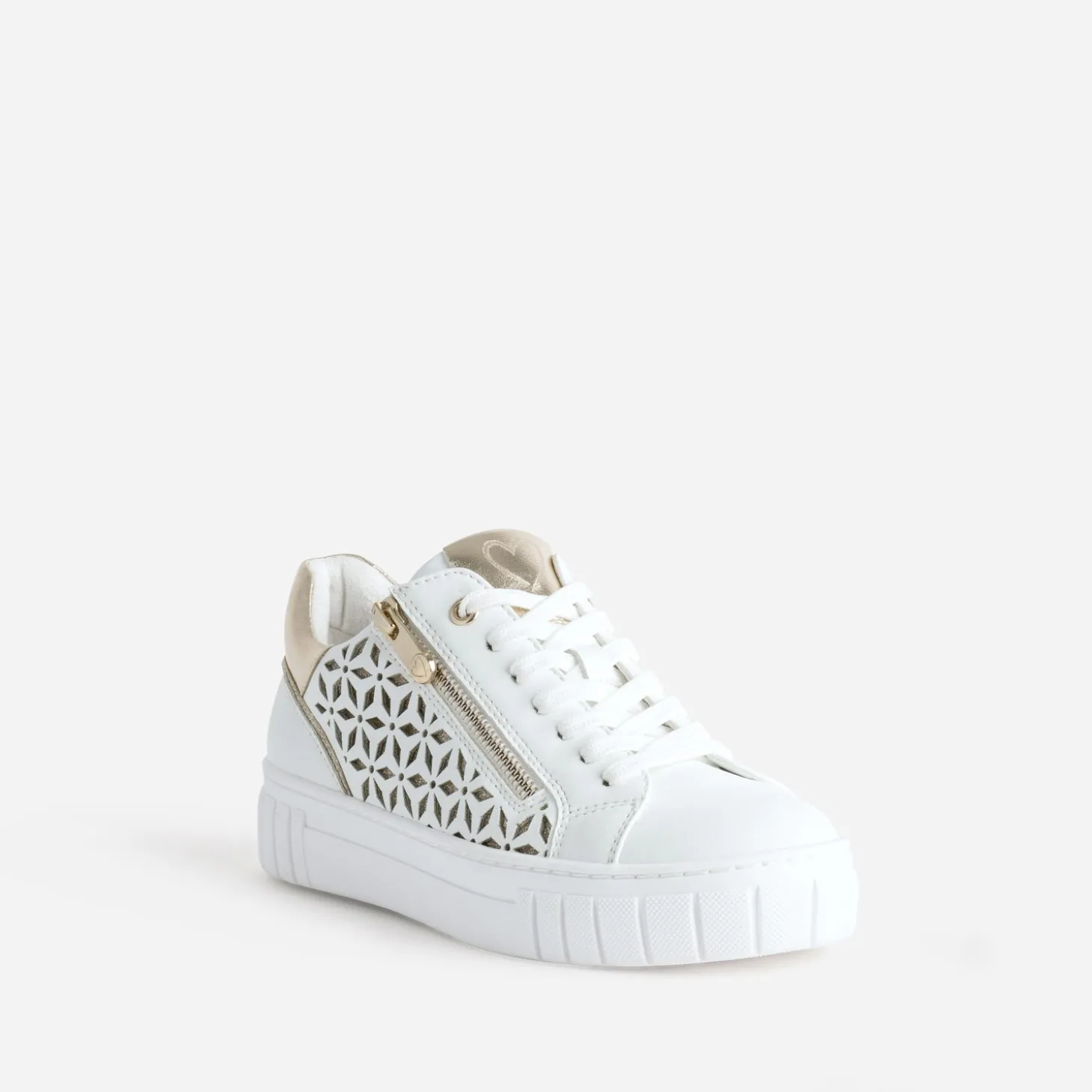 Coup de cœur annoncé pour cette tennis pour femme. Pour son coloris blanc, rehaussé de détails dorés. Pour sa matière synthétique lisse. Pour ses jeux d’ajourés à motifs graphiques, sur fond doré pailleté. Pour sa fermeture par lacet, renforcée par un zip latéral. Pour sa semelle à tendance plateforme. Et bien sûr, pour son embossage cœur sur la languette. Un modèle idéal pour le changement de saison et l’arrivée des beaux jours.