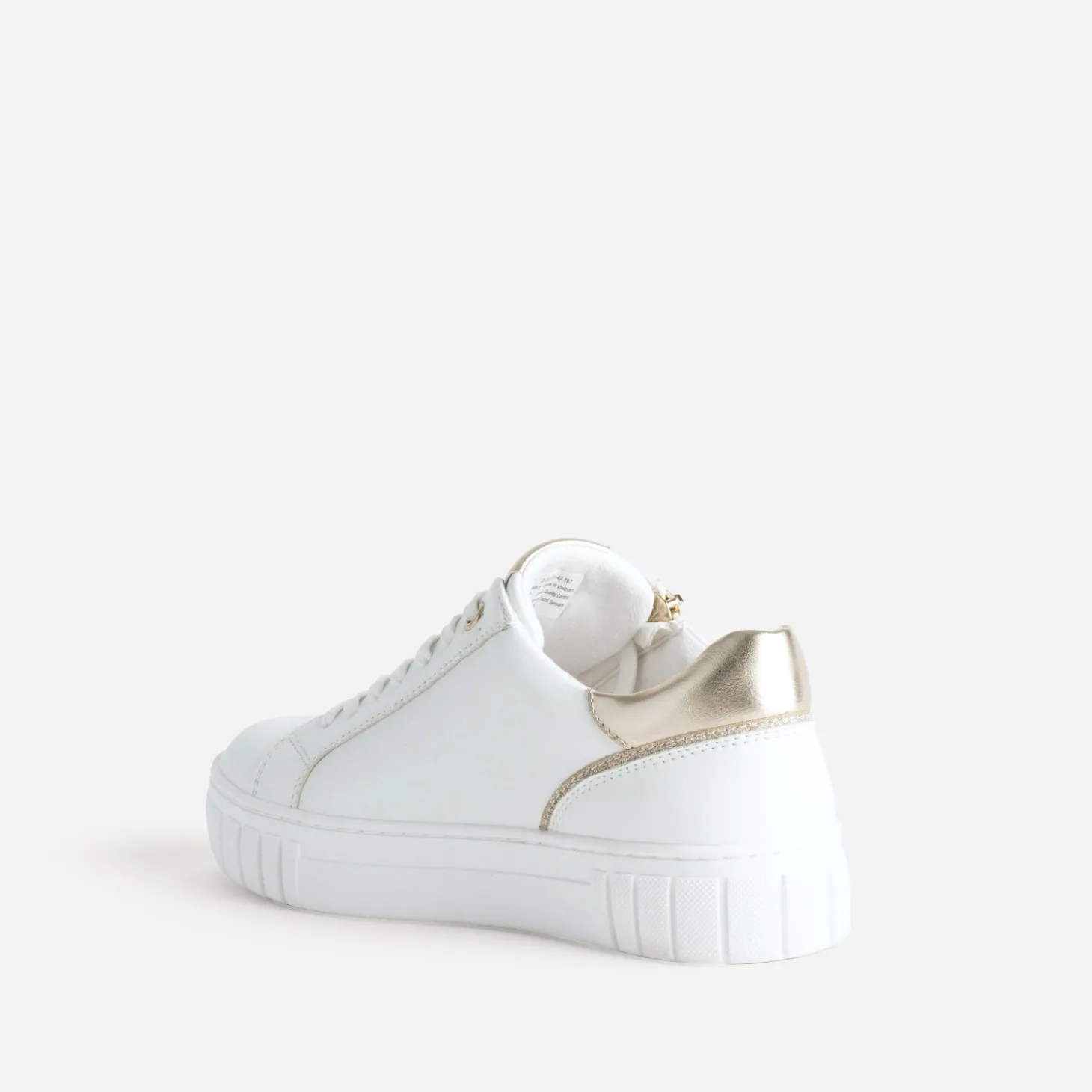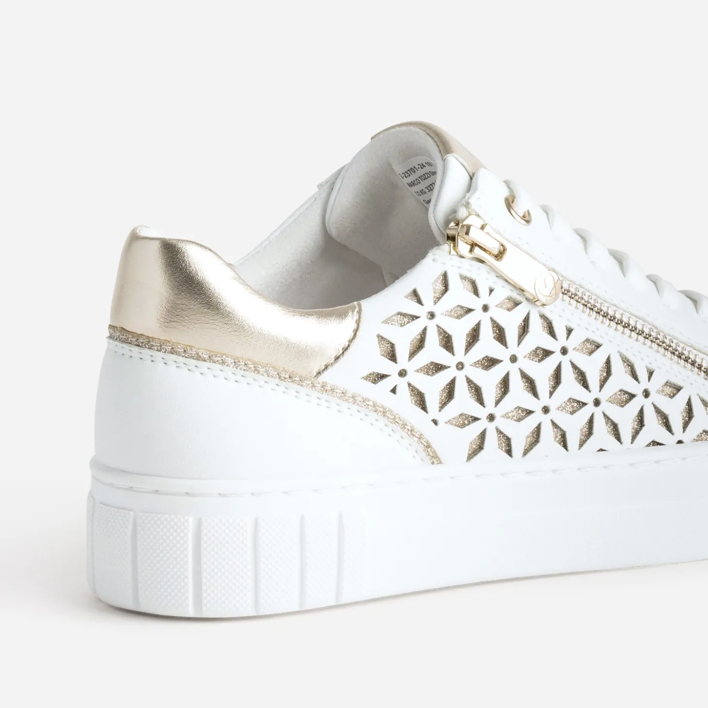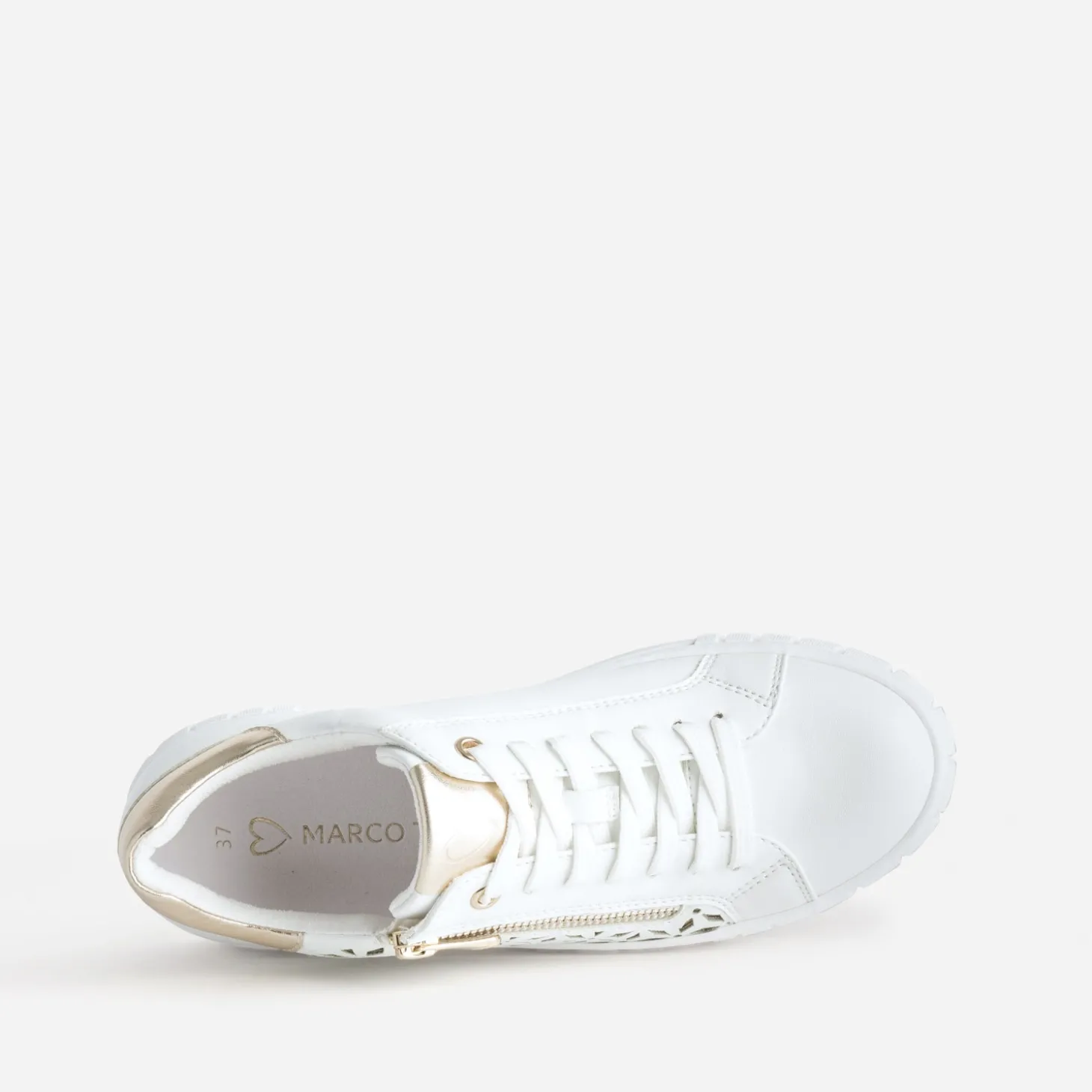 Coup de cœur annoncé pour cette tennis pour femme. Pour son coloris blanc, rehaussé de détails dorés. Pour sa matière synthétique lisse. Pour ses jeux d’ajourés à motifs graphiques, sur fond doré pailleté. Pour sa fermeture par lacet, renforcée par un zip latéral. Pour sa semelle à tendance plateforme. Et bien sûr, pour son embossage cœur sur la languette. Un modèle idéal pour le changement de saison et l’arrivée des beaux jours.