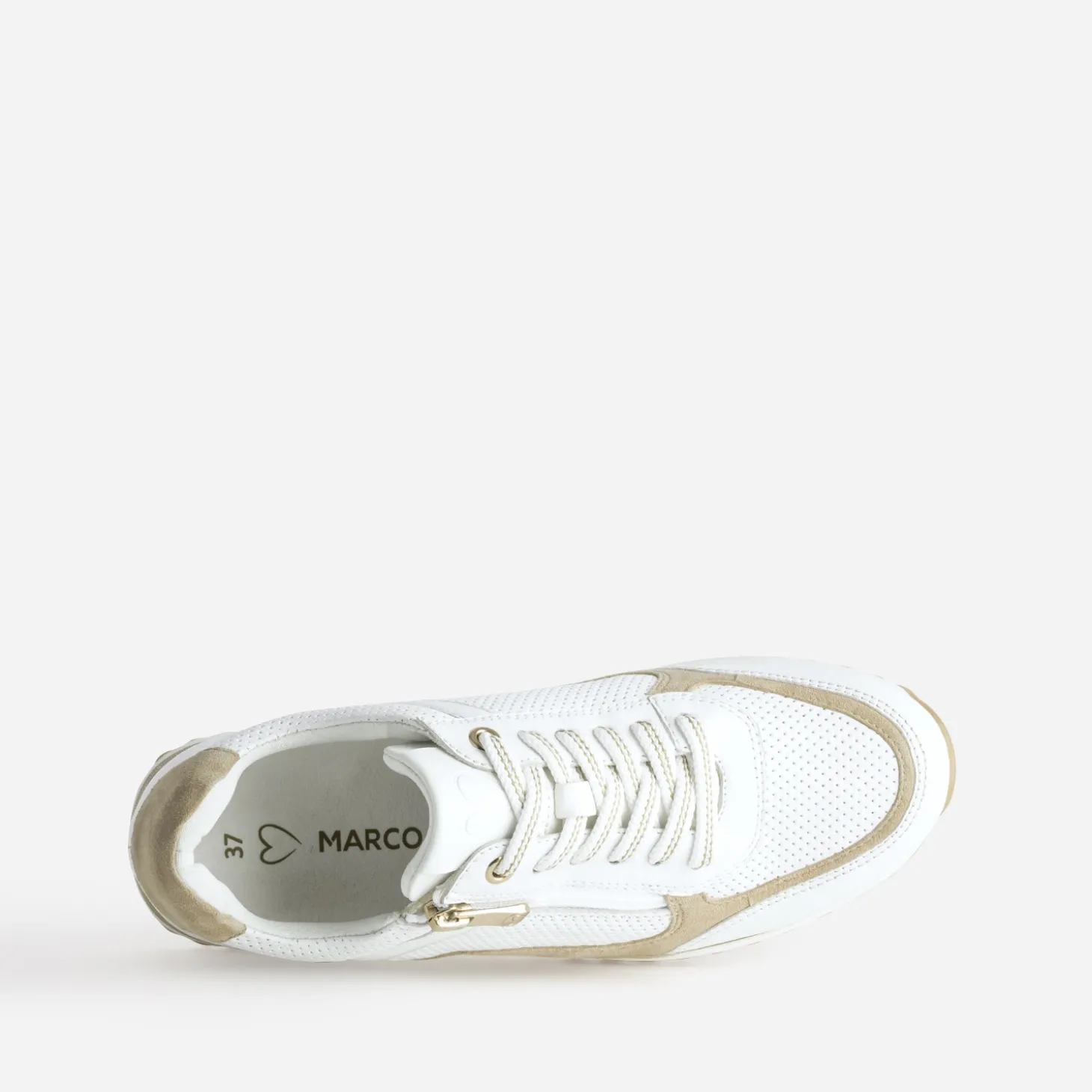 Blanc et beige côté couleurs. Cuir perforé et synthétique suédée côté matières. Cette tennis pour femme associe les contrastes, avec beaucoup de facilité. A l’intérieur, la semelle amovible permet de s’ajuster pour toujours plus de confort. Un modèle à imaginer avec une tunique en lin blanc et un pantalon chino beige, avec bords roulottés sur la cheville.