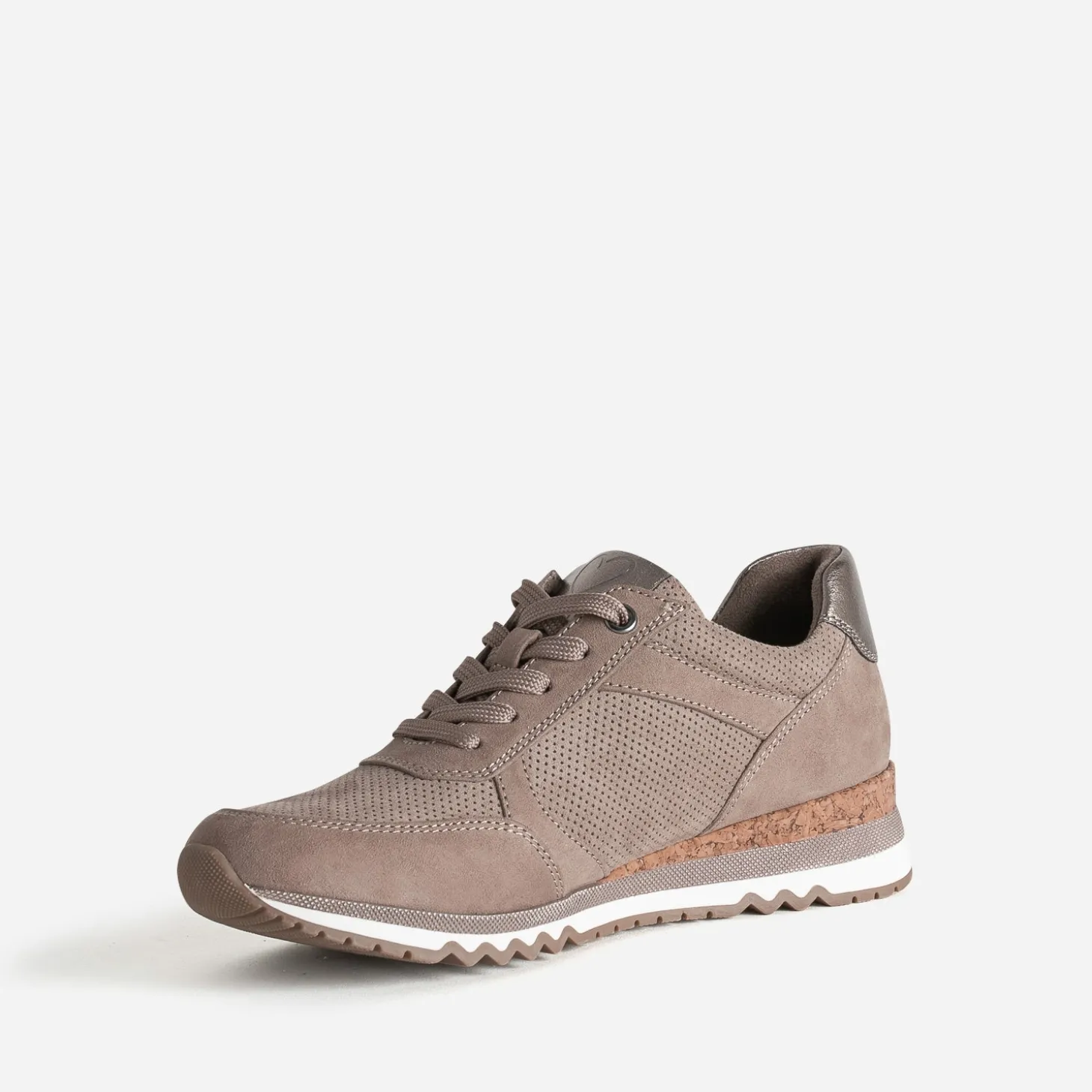 Cette tennis femme se décline en coloris taupe, idéale pour la mi-saison. Jeux de perforations, empiècements bronze métallisés sur la languette et le contrefort, apport de liège sur la semelle, les détails sont soignés. Montée sur une semelle sport crantée, elle présente une semelle première amovible et promet un confort inégalé.