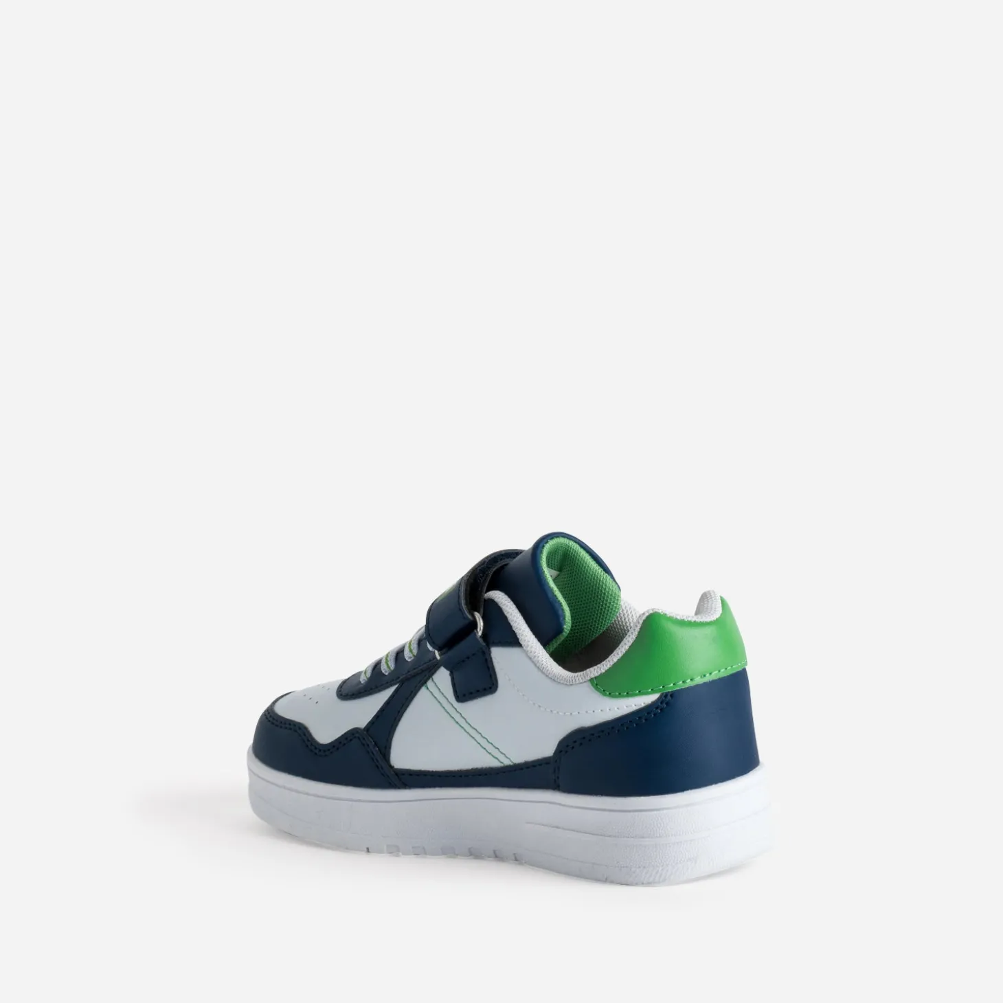 Cette tennis pour enfant reprend les codes du jeu vidéo. Par ses couleurs, bleu marine, blanc et vert. Par ses visuels : cube en 3D et pixels. Par son logo, posé sur le scratch, en renfort du lacet élastiqué. Un modèle parfait pour revendiquer sa passion, jusqu’en dehors de l’écran.