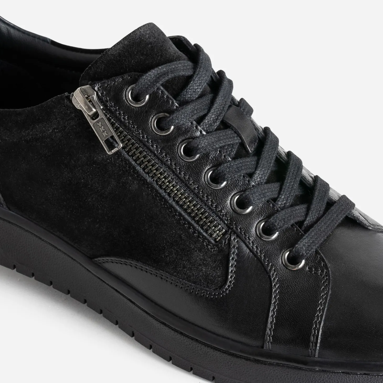 Mix de cuir lisse et de cuir velours validé à l’unanimité ! Cette tennis homme joue la carte de l’élégance, dans un coloris noir, intemporel. Le lacet plat, ton sur ton, est renforcé par un zip côté. Le contrefort marine fait, lui, écho à la doublure. Un modèle à oser avec un total look noir monochrome, pull à col roulé oversize sur pantalon baggy.