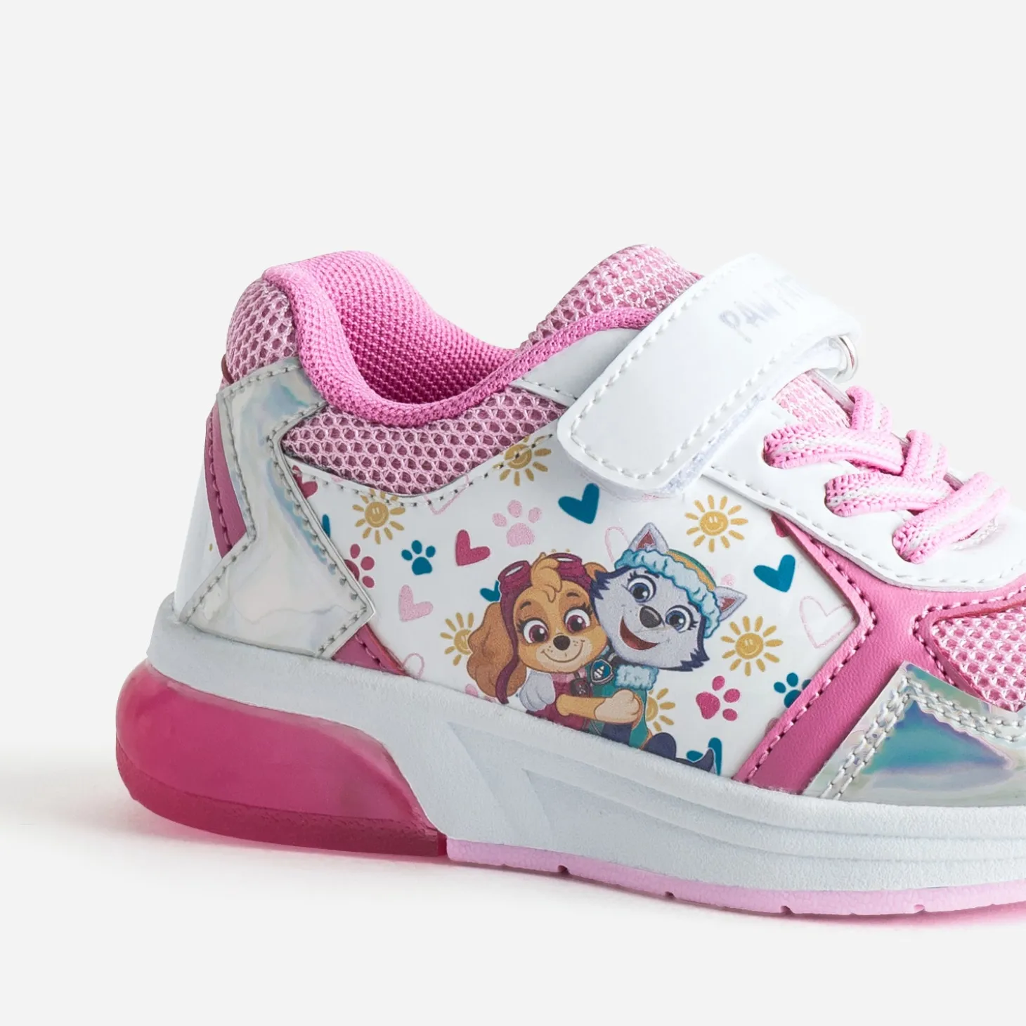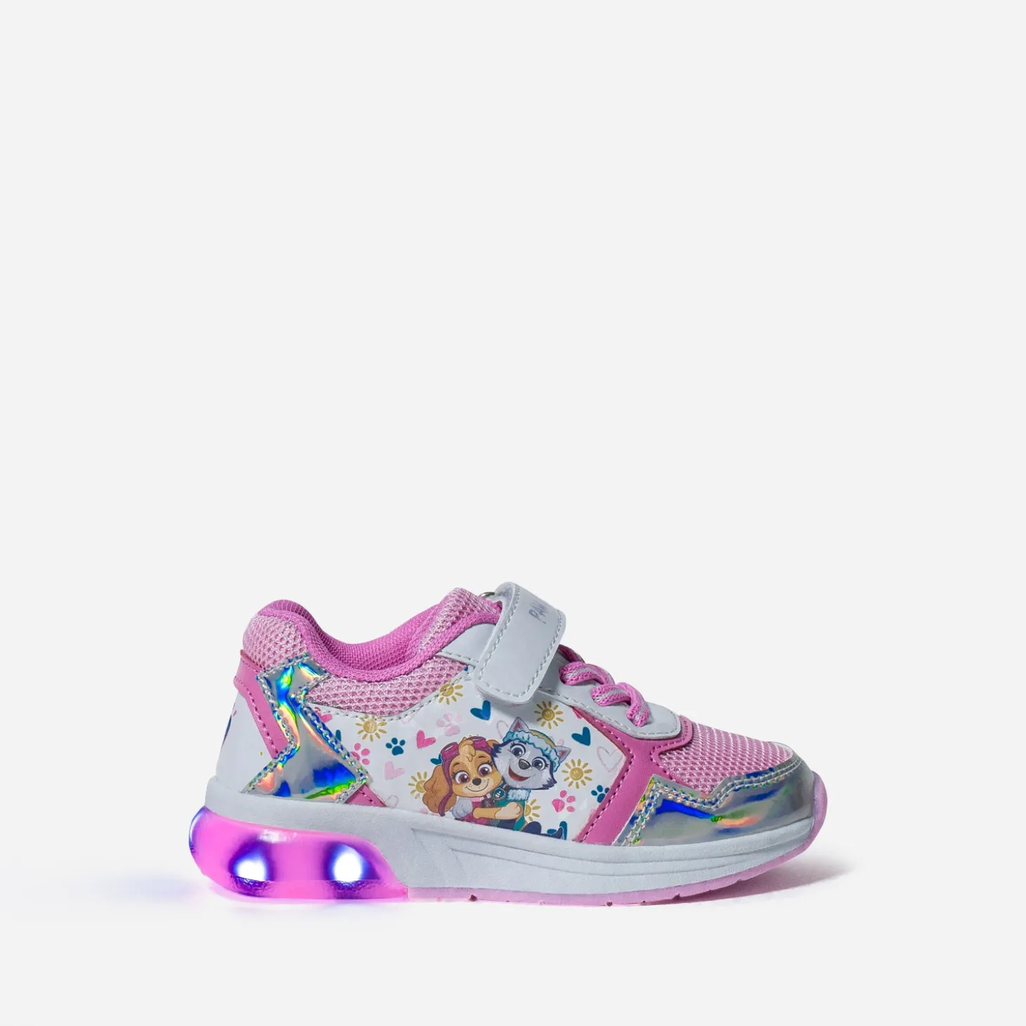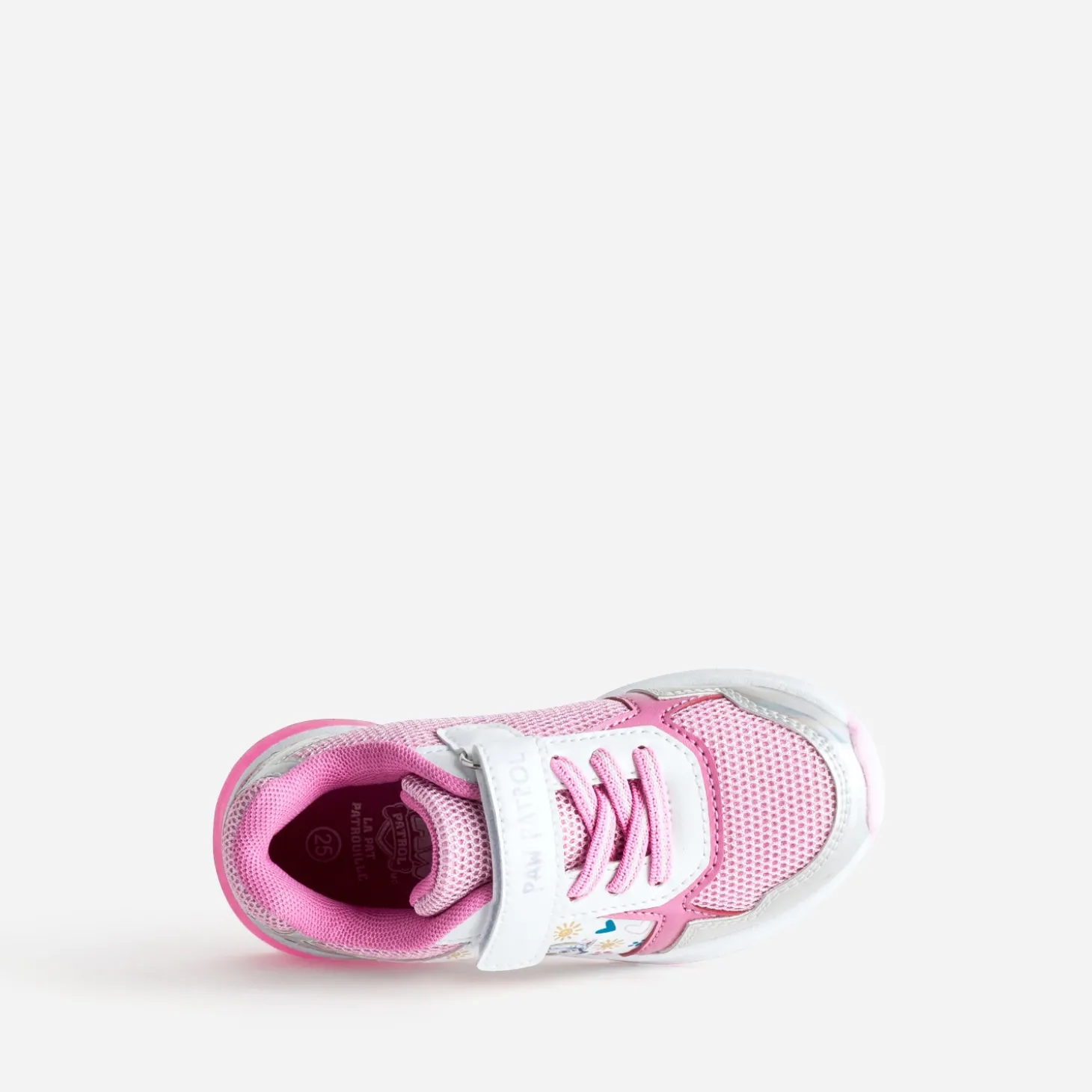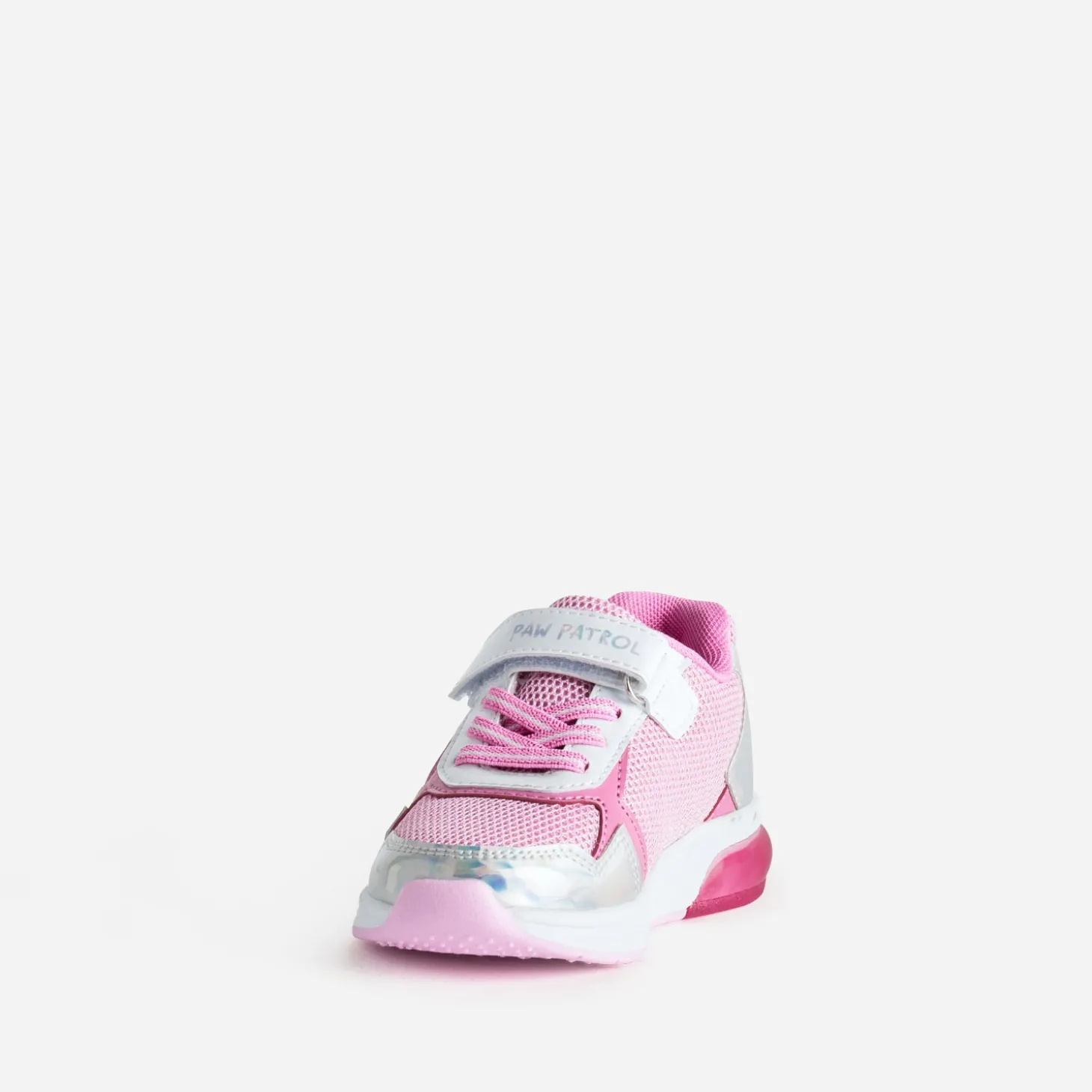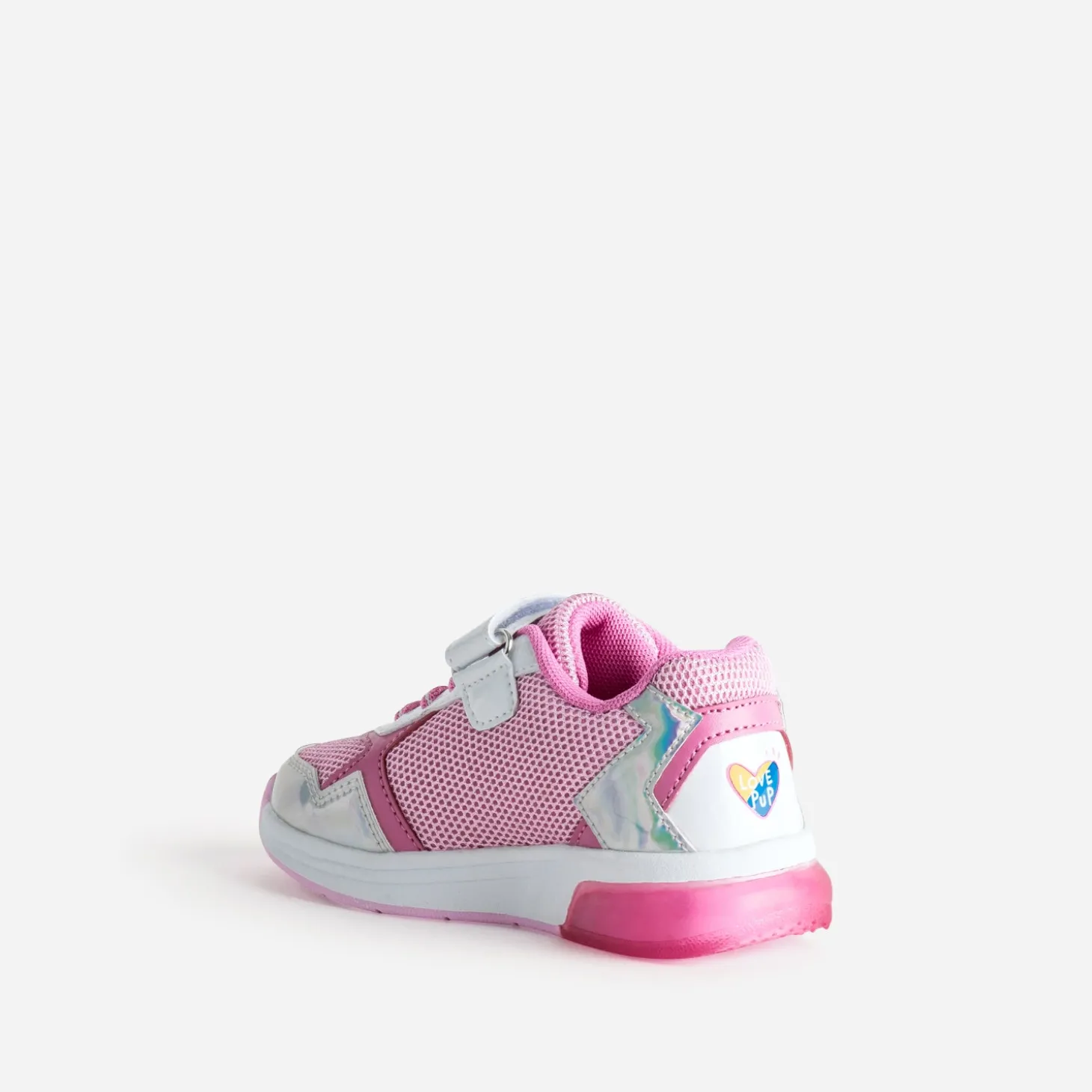 Stella, le cocker, et Everest, le husky, font la paire sur cette tennis pour fille. Bi-matière, elle associe matière synthétique et mesh, dans des tons de rose, blanc et gris iridescent. Pratique, elle présente un lacet élastiqué et un scratch, pour faciliter l’autonomie des petites filles. Le détail qui va la faire craquer ? Une semelle qui clignote à chaque pas !