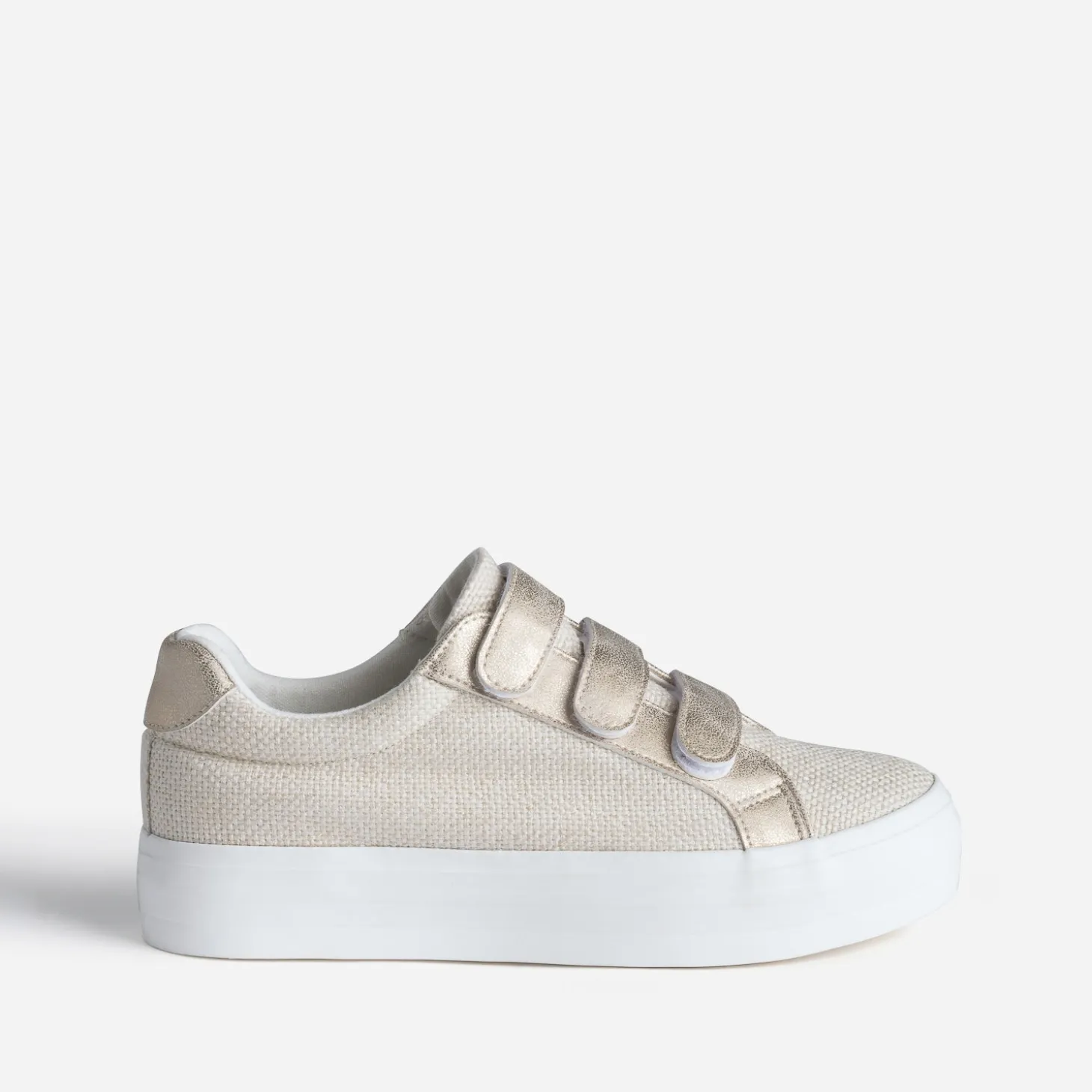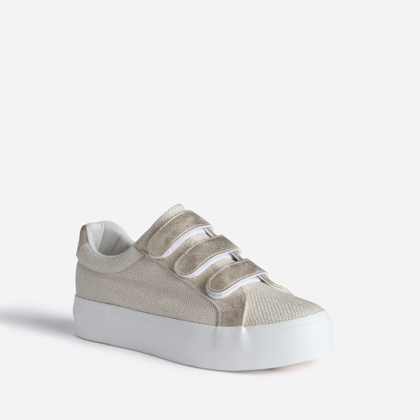 La tennis femme n’en finit pas de se réinventer. Un air de printemps souffle sur ce modèle de couleur beige, en textile tressé, rehaussé de touches dorées effet patiné, sur les trois scratchs et le contrefort. Elle est modernisée par une semelle à plateforme, pour gagner quelques centimètres sans effort. Apportez du chic à vos tenues du quotidien, et du cool aux tenues raffinées.