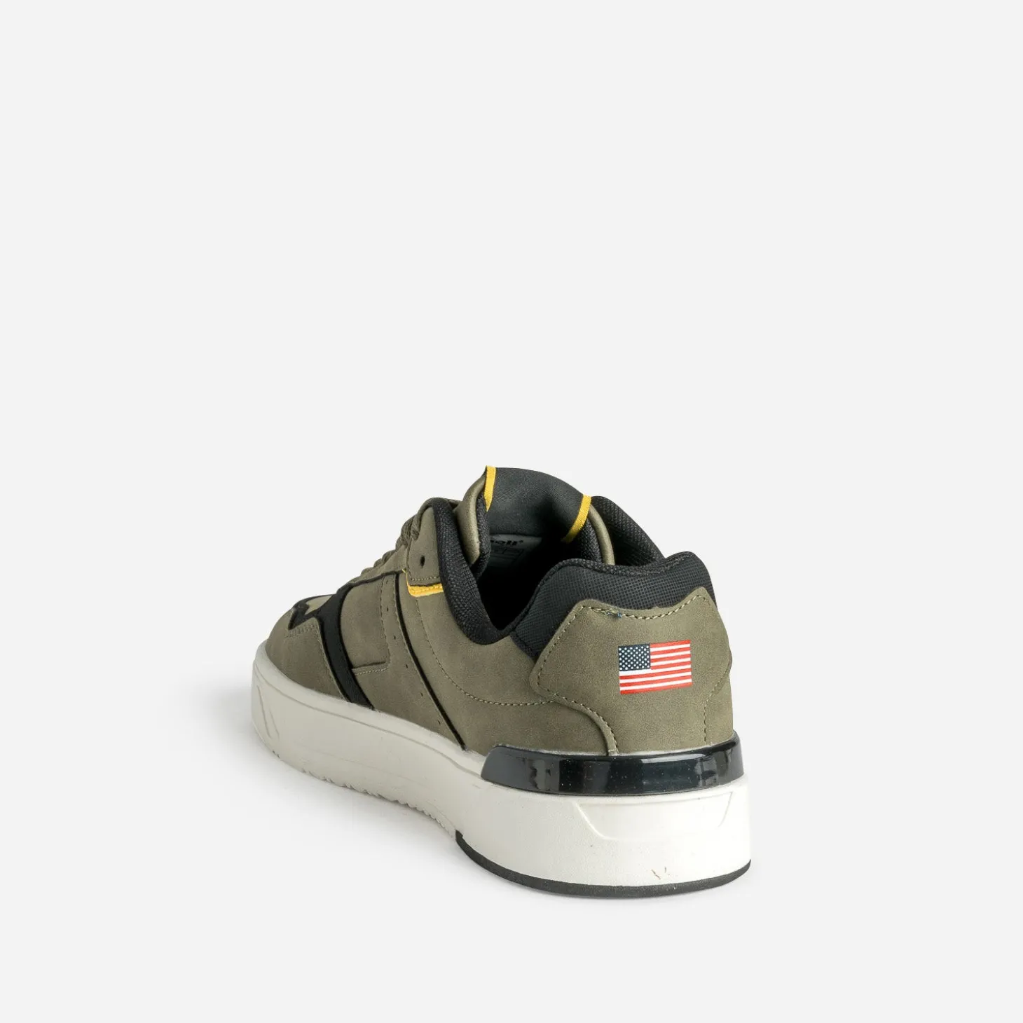 Kaki, noir, jaune. Laissez-vous inspirer par la palette de couleurs de cette tennis pour homme. Son design minimaliste s’inscrit dans la tendance. Le drapeau américain, placé sur le contrefort, rappelle l’origine de la marque. Un modèle idéal pour le quotidien, avec un polo blanc et un cargo kaki.