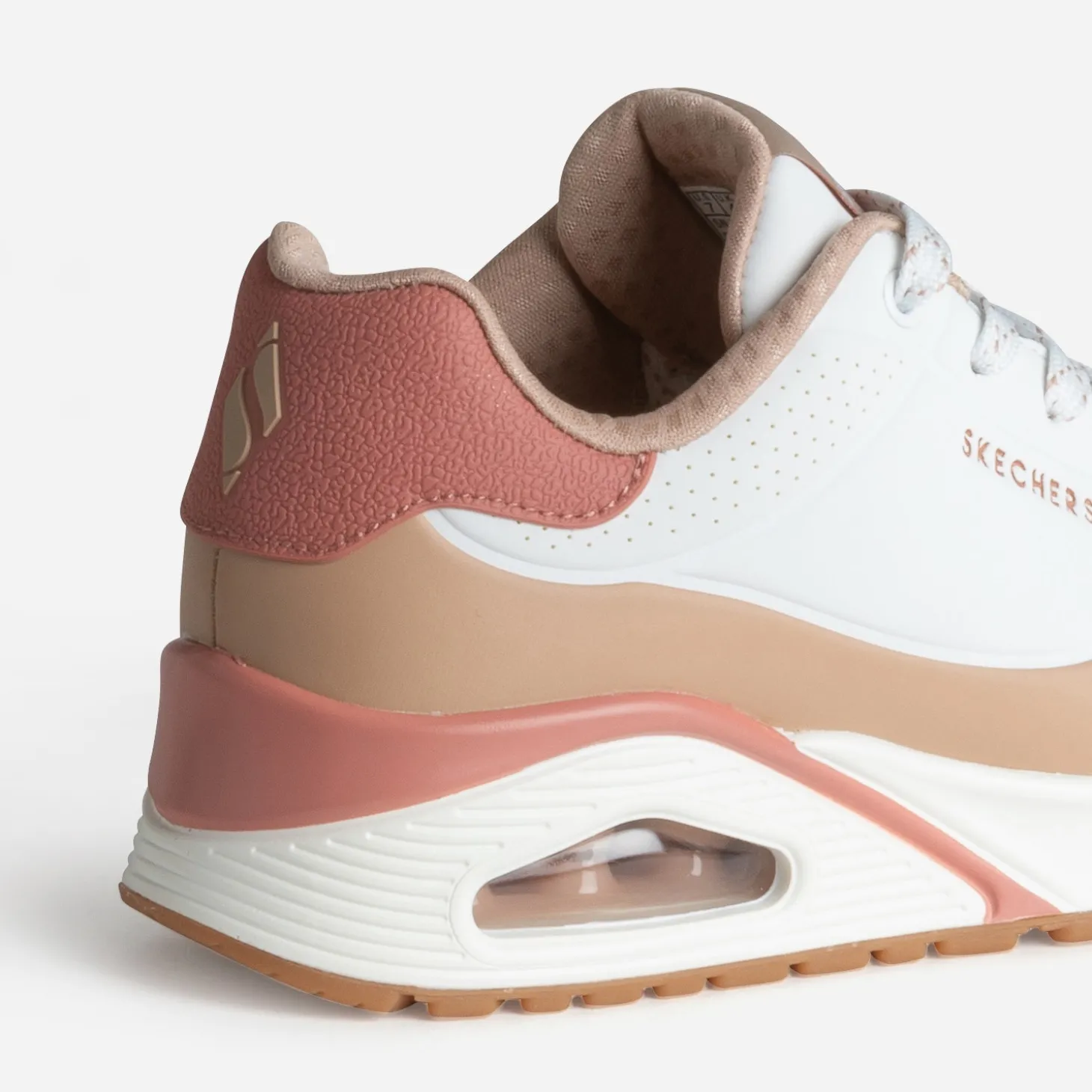 Le modèle Uno pour femme concilie deux grandes tendances, celle des sneakers et celle des teintes naturelles. Mettez une touche de fun dans vos looks avec cette tennis blanche et beige, rythmée d’un contrefort rose. La semelle intérieure se démarque par un système Air-Cooled à mémoire de forme, pour un confort incomparable et une respirabilité incomparable. Une tennis pour faire le show, en jean mom gris et sweat pastel.