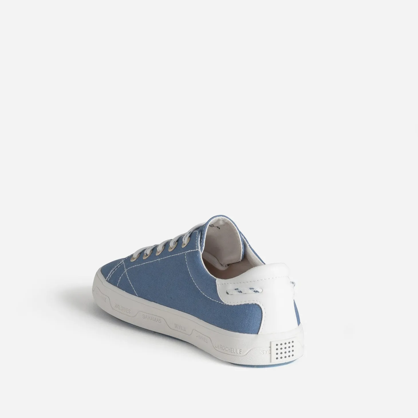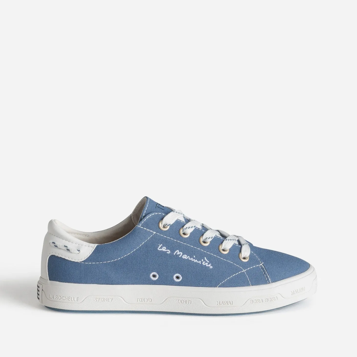 ‘Les Marinières’, c’est une ligne de tennis iconiques, signées, sur la semelle, de noms de villes situées en bord de mer comme Hawaï, La Rochelle ou Malibu. Elle est confectionnée en toile bleue, avec broderies sur la languette et le côté, et cordon esprit marin sur le contrefort. Un modèle, avec semelle intérieure effet liège, à réserver à l’été, avec une tenue décontractée.
