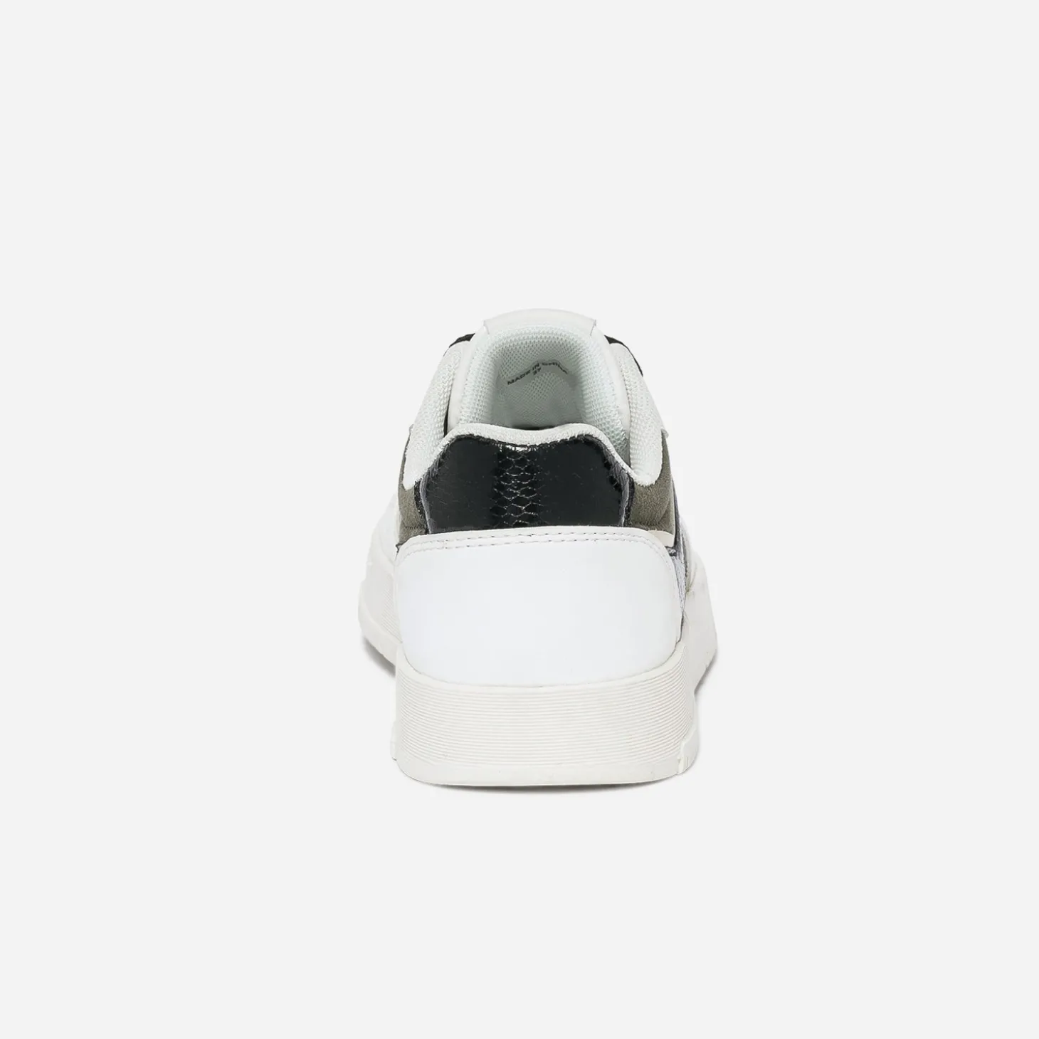 A dominante blanche, cette tennis est rythmée de touches kaki, noires et dorées, de chaque côté. Le dessus du pied est entièrement perforé, les lacets, pailletés, et les côtés et le contrefort, dévoilent une finition vernie et un effet python. Privilégiez les mêmes coloris, pour votre tenue à tendance sporty.