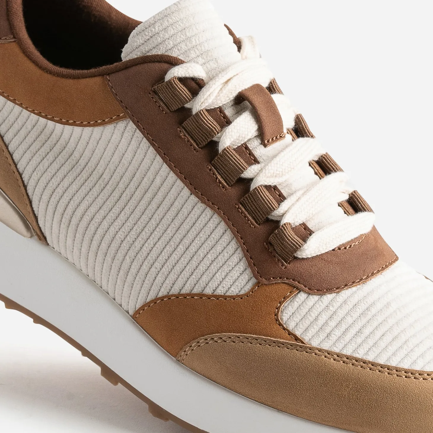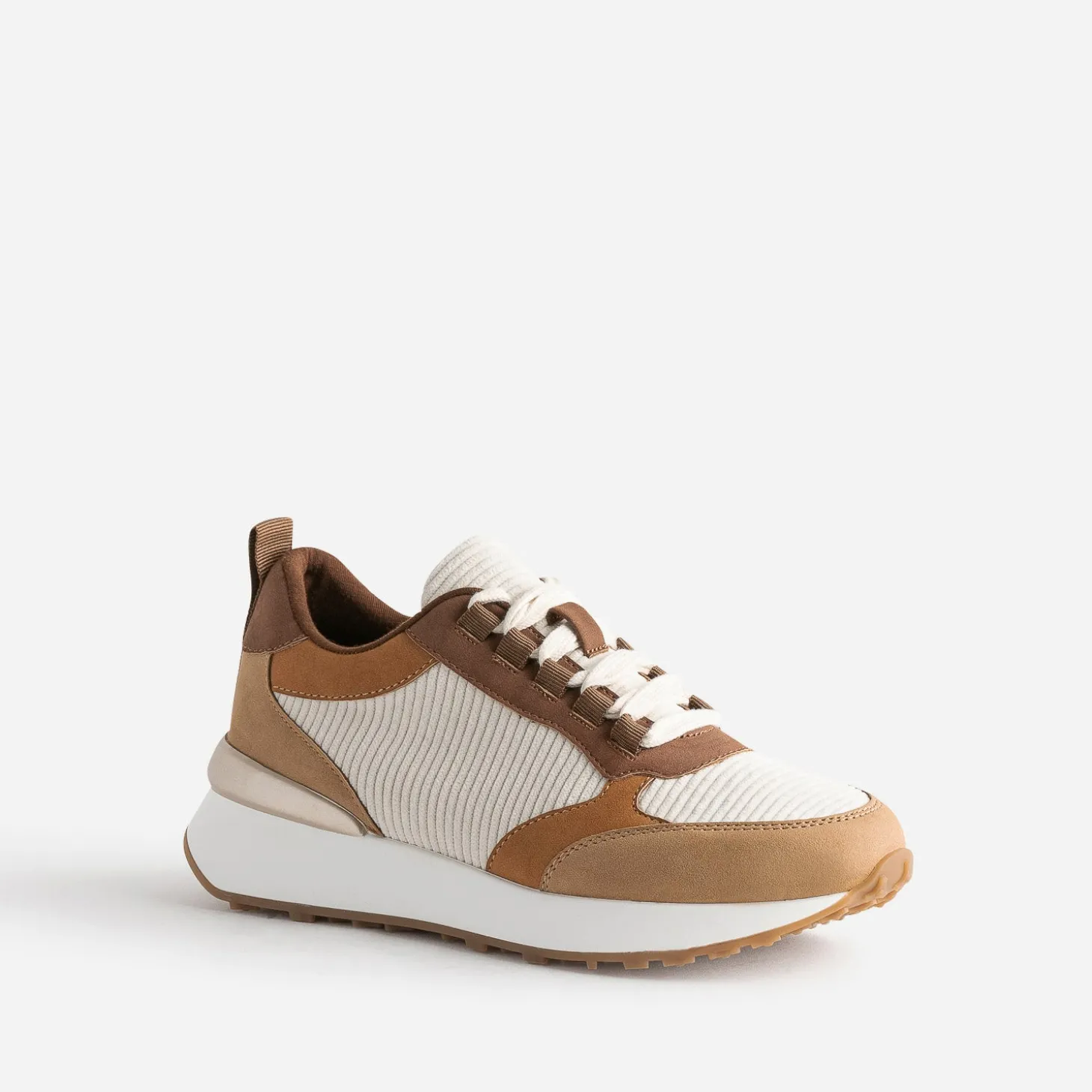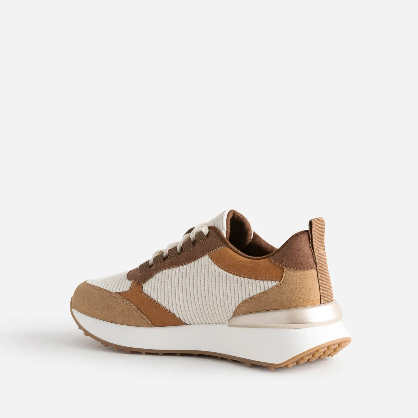 Camel, marron, écru, ce sont les couleurs dominantes de cette tennis pour femme. Mix de textile velours côtelé et matière synthétique suédée, elle est montée sur une semelle sport légèrement compensée. Un modèle à privilégier avec une tenue dans les tons naturels, avec des touches de doré.
