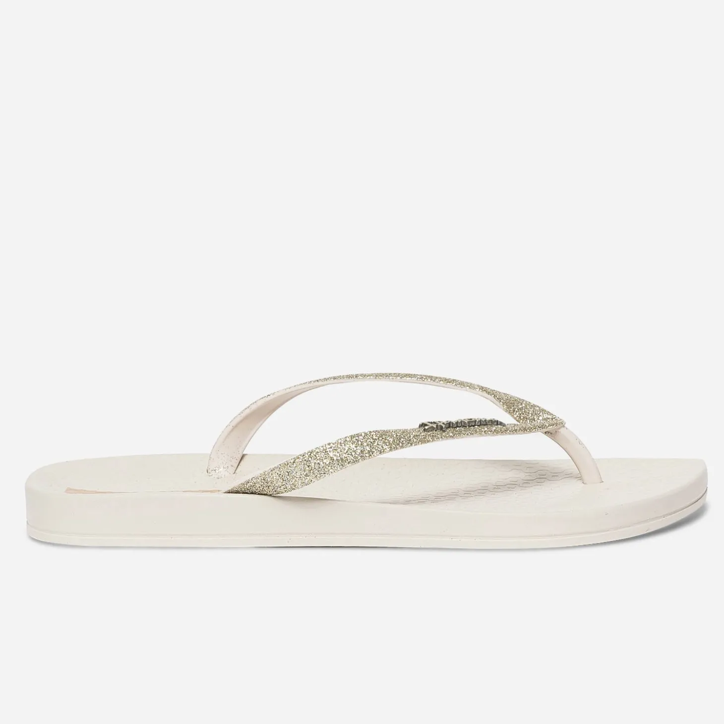 Cette tong pour femme se décline en coloris beige intemporel. Son atout ? Des brides pailletées dorées. La semelle se démarque par un motif graphique, qui fait écho à celui du remblai de la plage d’Ipanema. Un modèle parfait pour un twist fun et chic, avec toutes les tenues d’été.