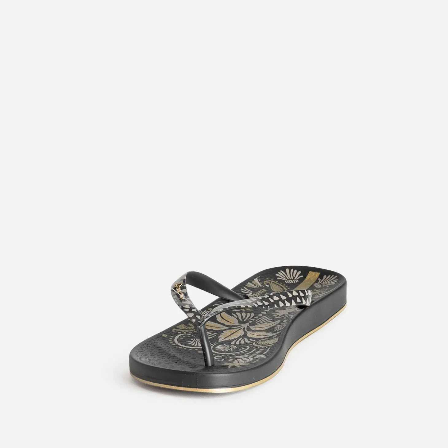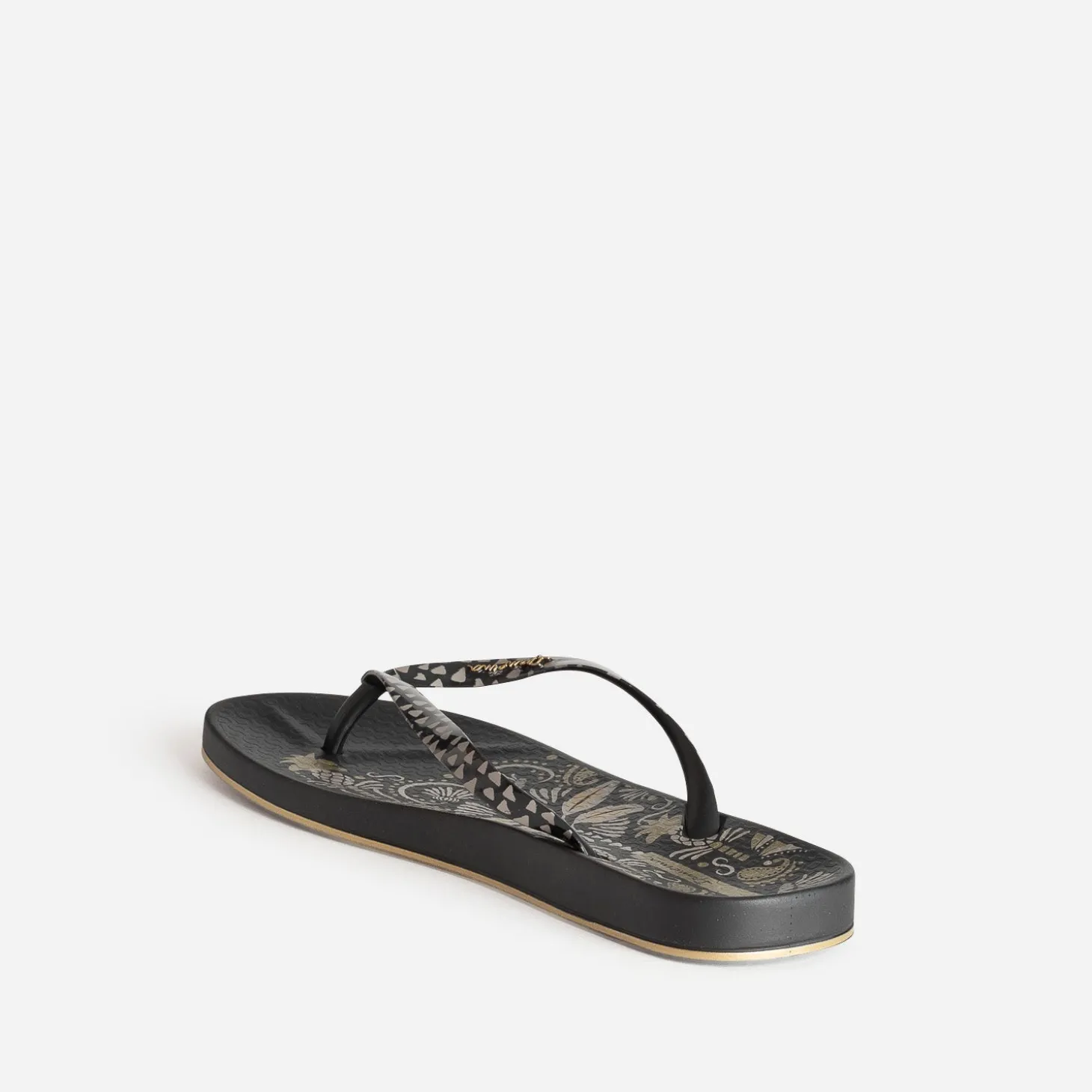 Adepte des tatouages permanents ou éphémères ? Cette tong est faite pour vous ! Bien plus qu’une simple chaussure de plage, elle dévoile une semelle ornée d’un motif floral gris et doré sur fond noir, façon parure tatouée, et des brides graphiques. Un modèle au confort iconique, à accompagnera d’un combishort noir et de bijoux dorés.