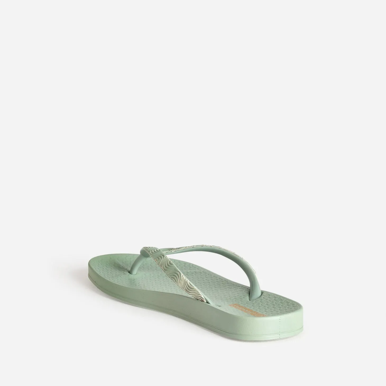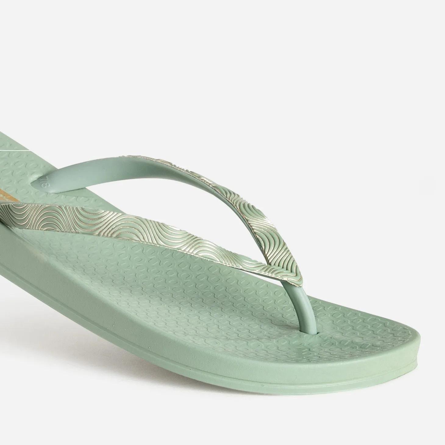 Priorité au confort cet été, avec cette tong pour femme. Son secret ? Une conception en plastique souple recyclé et une semelle qui soulage la plante du pied. Déclinée en coloris vert d’eau, elle présente deux brides avec décor graphique métallisé. Un modèle pour accompagner vos journées ensoleillées en maillot de bain comme vos soirées estivales en robe longue.