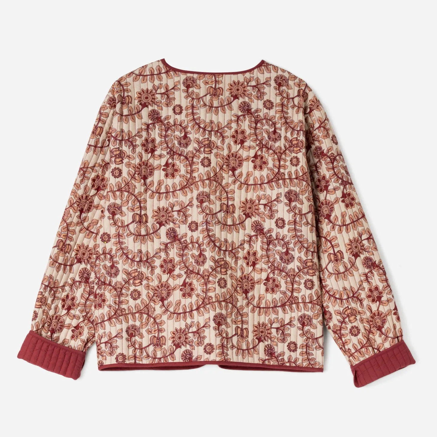 La veste matelassée s’impose comme la tendance phare de la mi-saison : légère, stylée et parfaite pour les températures changeantes. Confectionnée en textile, elle présente un imprimé fleurs indiennes beige sur fond rouge foncé. Préférez-la sur un look monochrome beige, avec des mocassins en cuir camel et le maxi cabas assorti.