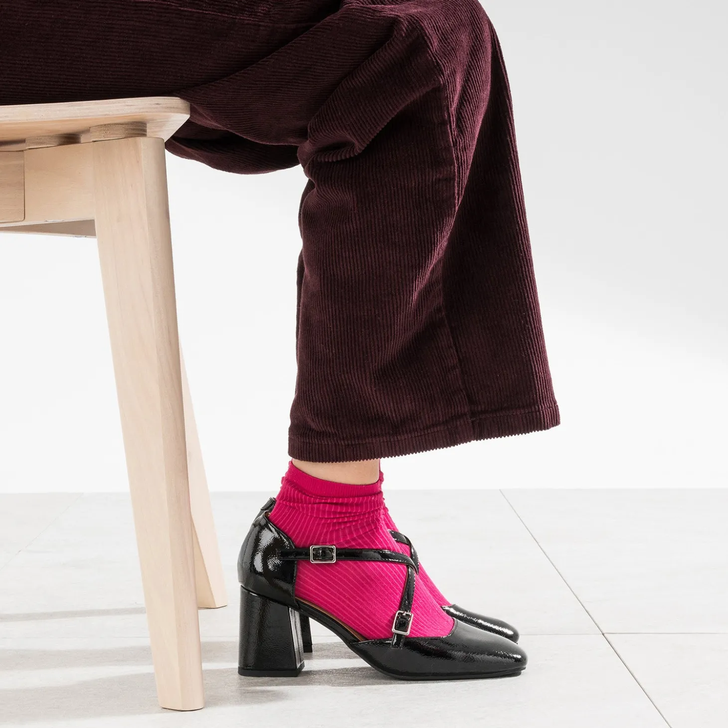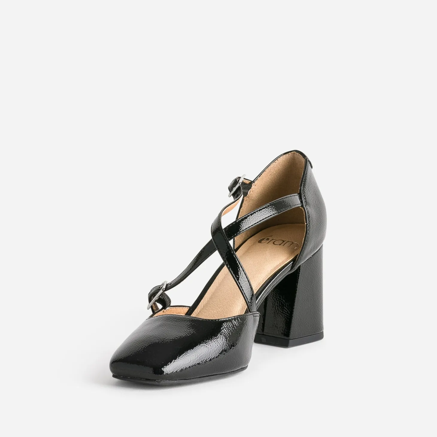 La tendance est au soulier féminin, un brin rétro. Une illustration parfaite avec cette babies pour femme. En matière synthétique lisse, elle se décline en coloris noir et finition vernie jusqu’à la pointe de son talon, et deux fines brides enveloppent le pied avec subtilité. Un modèle à décaler avec des socquettes blanches en dentelle.