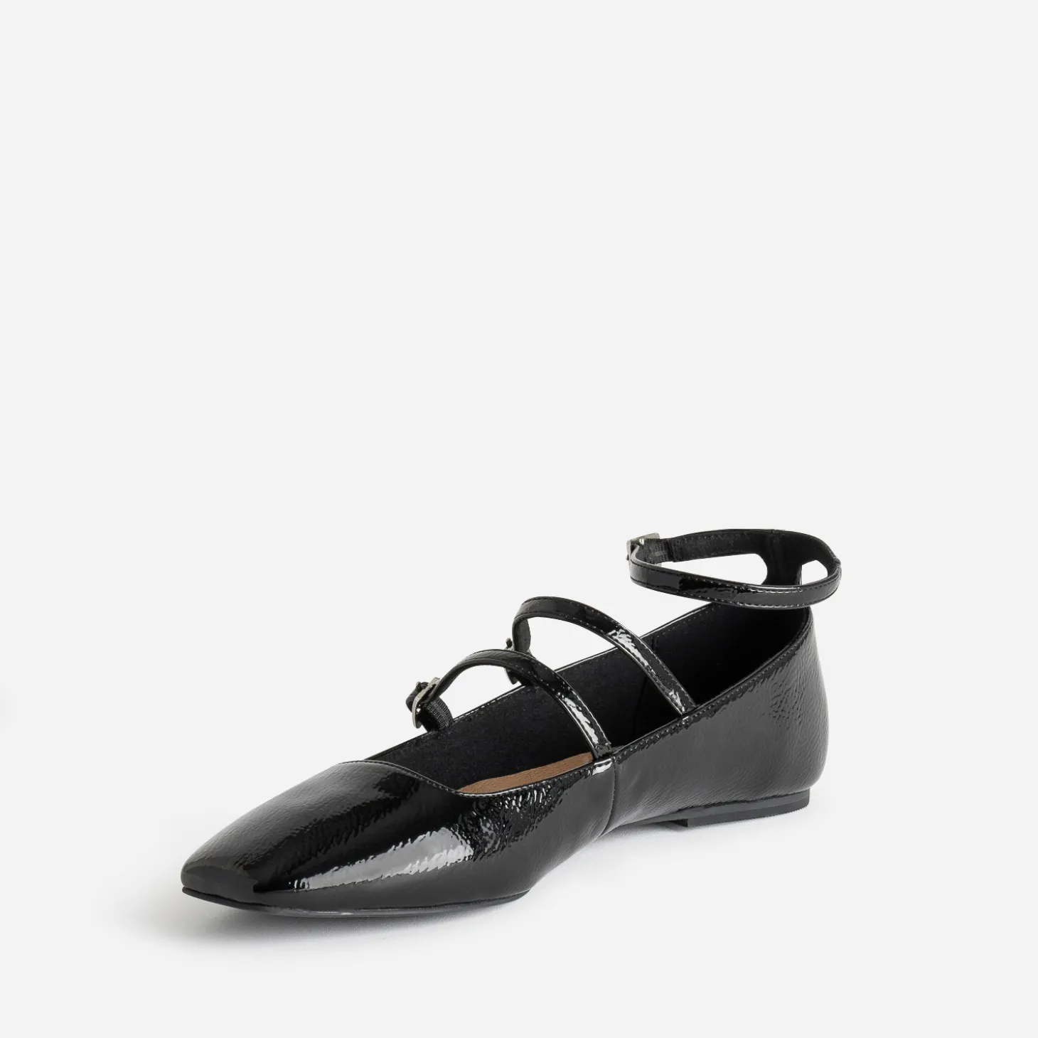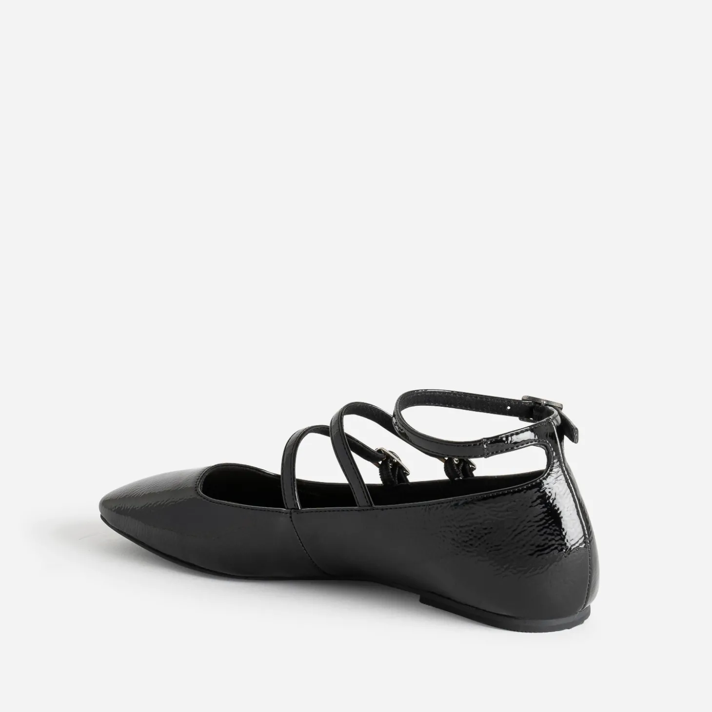 1, 2, 3 brides pour cette babies pour femme. Elle célèbre le retour du plat, avec style et élégance. Par son bout carré, par son coloris noir, par sa finition vernie. Vous hésitez ? Elle sera votre meilleure alliée, de jour comme de nuit. Un modèle qui a déjà fait ses preuves, avec un body et une jupe midi satinée, ou plus inattendu, avec un blouson esprit motard et un legging en cuir.