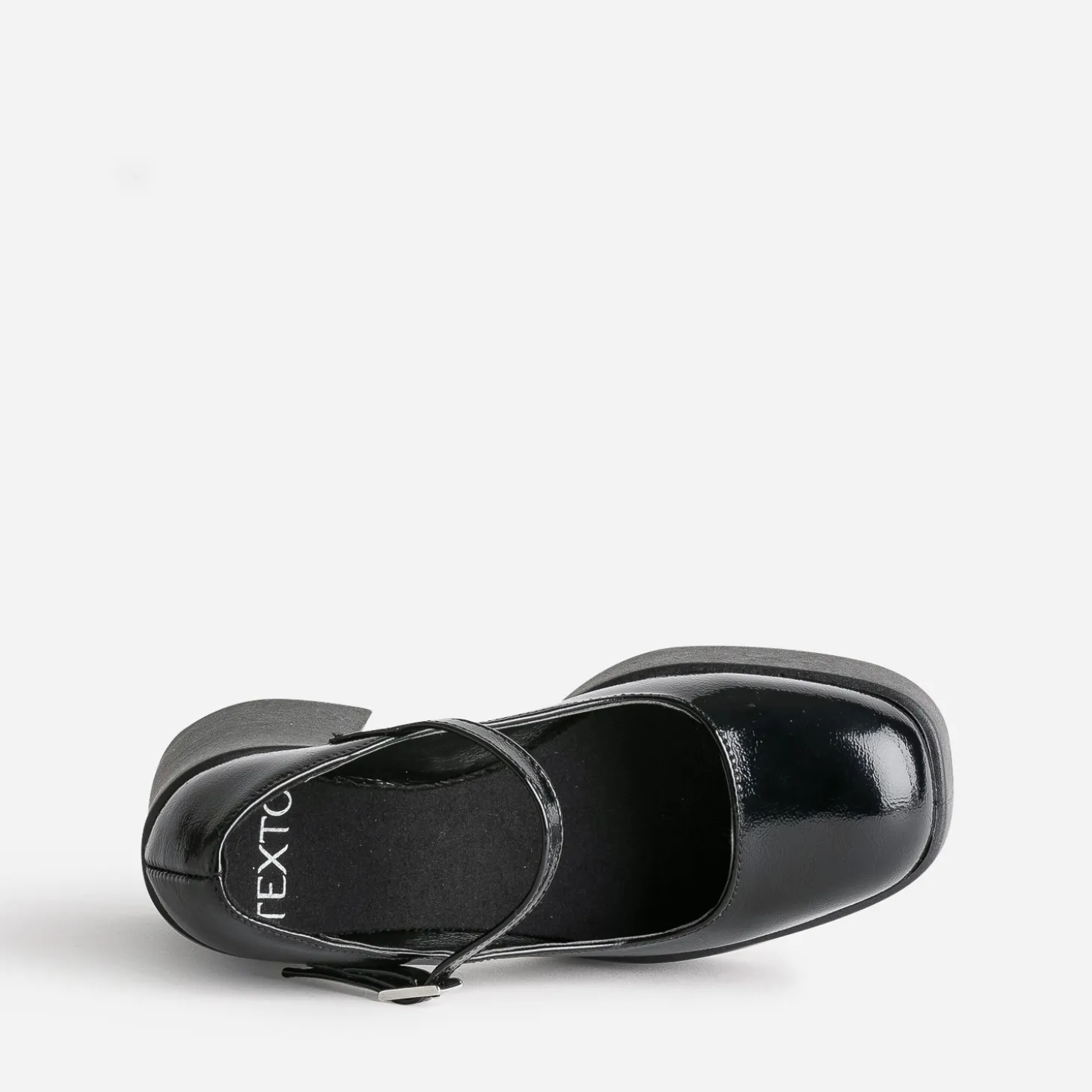 La tendance est au style rétro. La tendance est à la semelle épaisse. La tendance est aux couleurs sobres. Cette babies pour femme coche toutes les cases, pour vous séduire. En matière synthétique noire, elle se démarque par une finition vernie et se ferme par une fine bride à boucle. elle est montée sur une semelle ton sur ton à plateforme, 10,5 cm à l’arrière et 3 cm sur le patin avant. Privilégiez-la, dès l’arrivée du printemps.