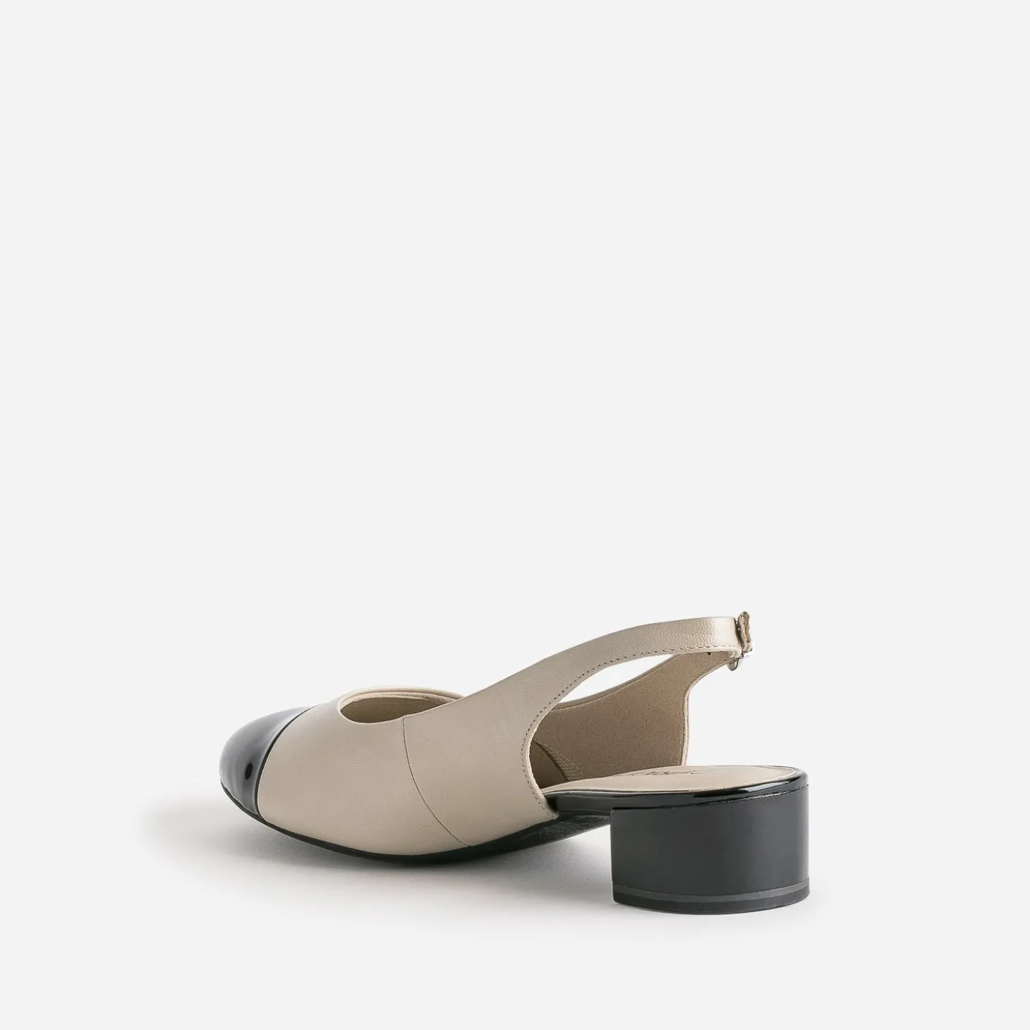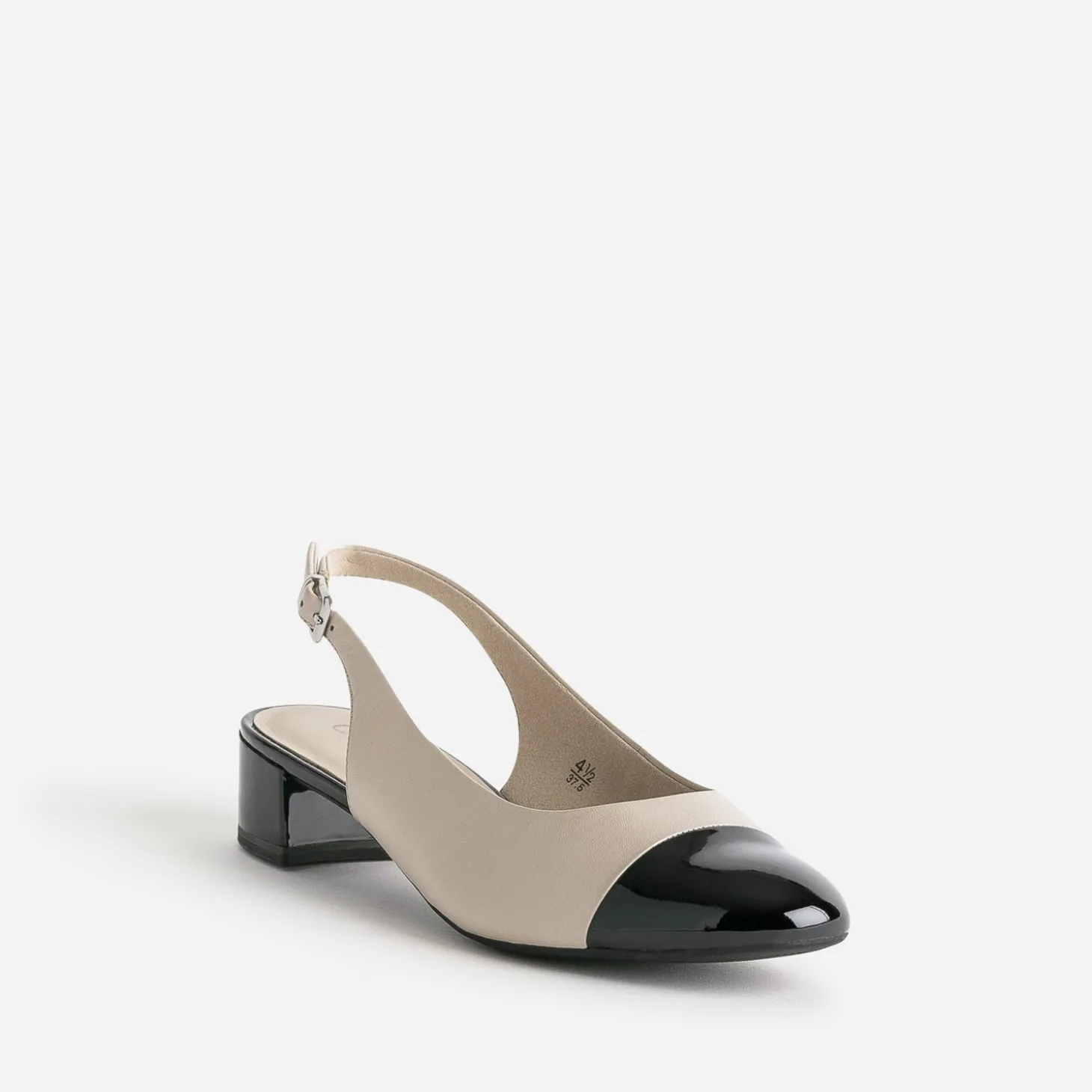 Cette ballerine dévoile un nouveau design, avec toujours une tige légèrement élastiquée et surtout un petit talon très confortable de 3,5 cm. Laissez-vous séduire par la souplesse incroyable de son cuir beige mat, rehaussé de détails vernis noirs sur le bout et le talon, dans une parfaite harmonie. Détail chic, elle ose une bride inspirée de la célèbre slingback. La semelle première en cuir est dotée de la technologie ‘onAIR’, garantissant un meilleur amorti et une aération optimale de la chaussure. Un modèle idéal au quotidien comme pour une occasion spéciale.