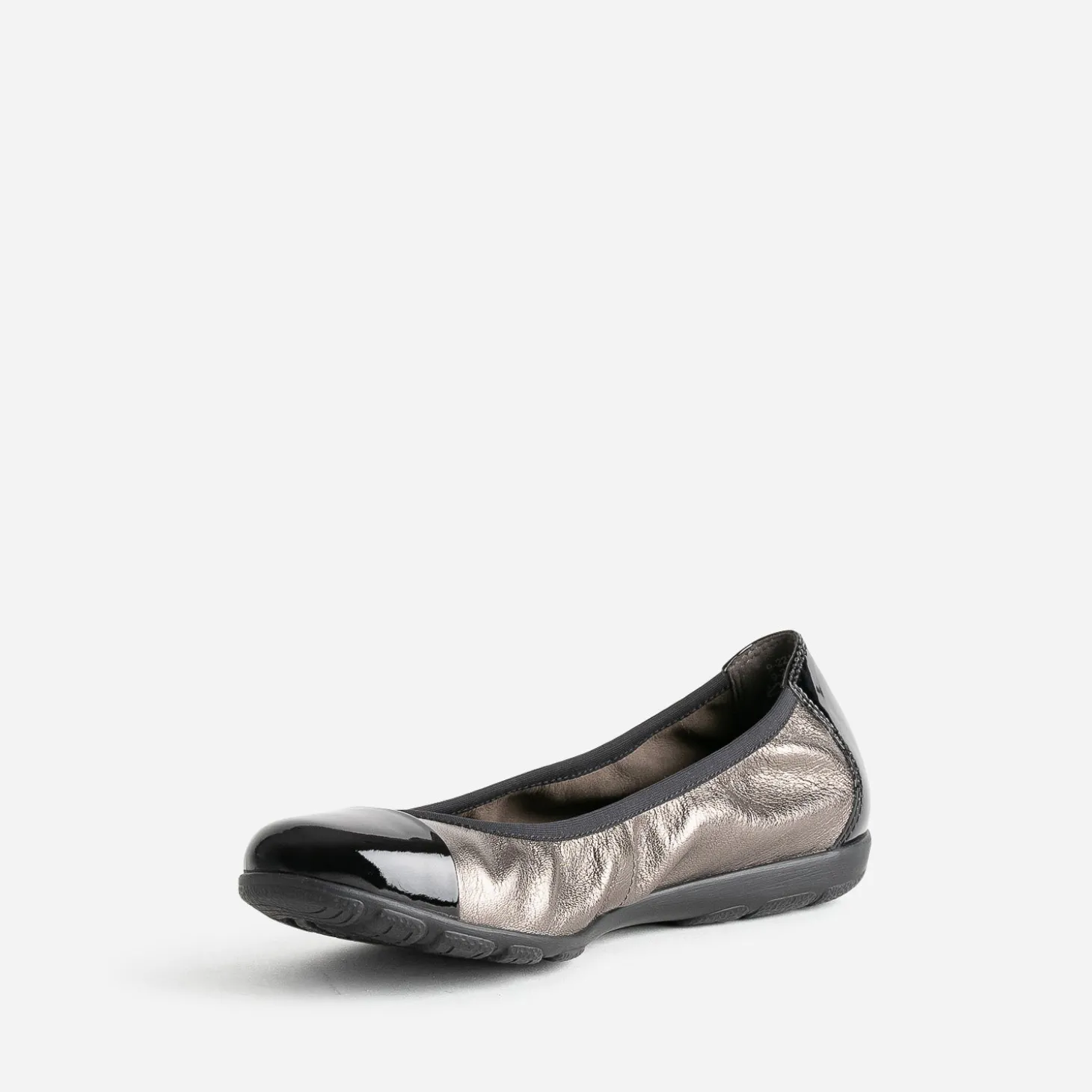 Laissez-vous séduire par la souplesse incroyable de son cuir souple non doublé, animé d’une finition métallisée. La semelle première en cuir est dotée de la technologie ‘onAIR’, garantissant un meilleur amorti et une aération optimale de la chaussure. Coloris bronze, elle est finalisée par un bout et un contrefort noir verni, dans une belle harmonie.
