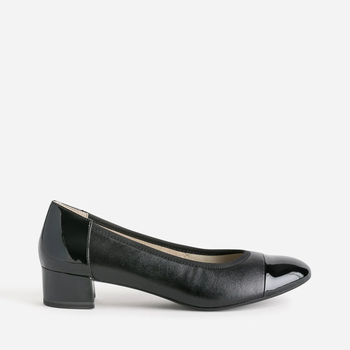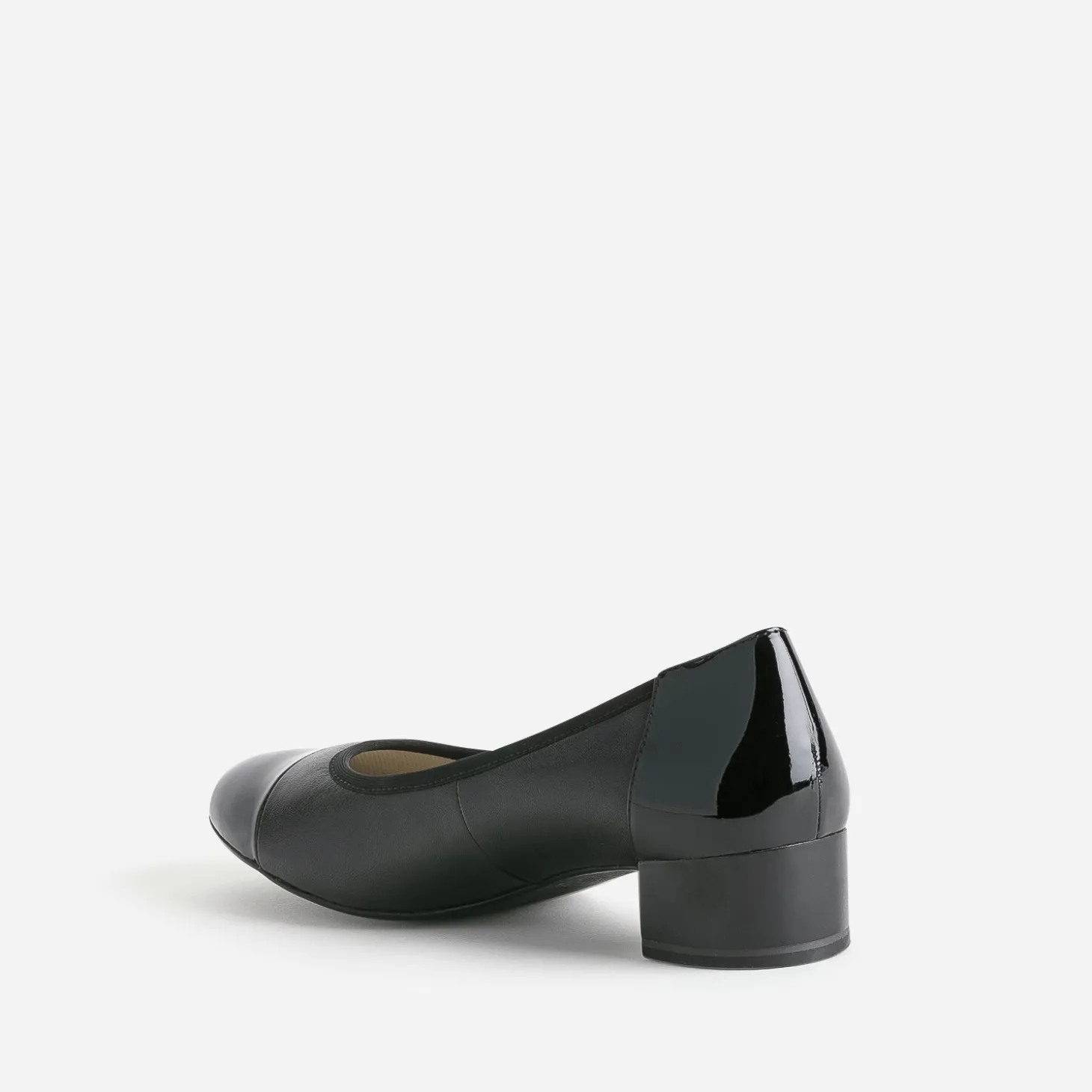 Cette ballerine dévoile un nouveau design, avec toujours une tige légèrement élastiquée et surtout un petit talon très confortable de 3,5 cm. Laissez-vous séduire par la souplesse incroyable de son cuir noir mat, rehaussé de détails vernis ton sur ton sur le bout, le contrefort et le talon, dans une parfaite harmonie. La semelle première en cuir est dotée de la technologie ‘onAIR’, garantissant un meilleur amorti et une aération optimale de la chaussure. Un modèle idéal au quotidien comme pour une occasion spéciale.