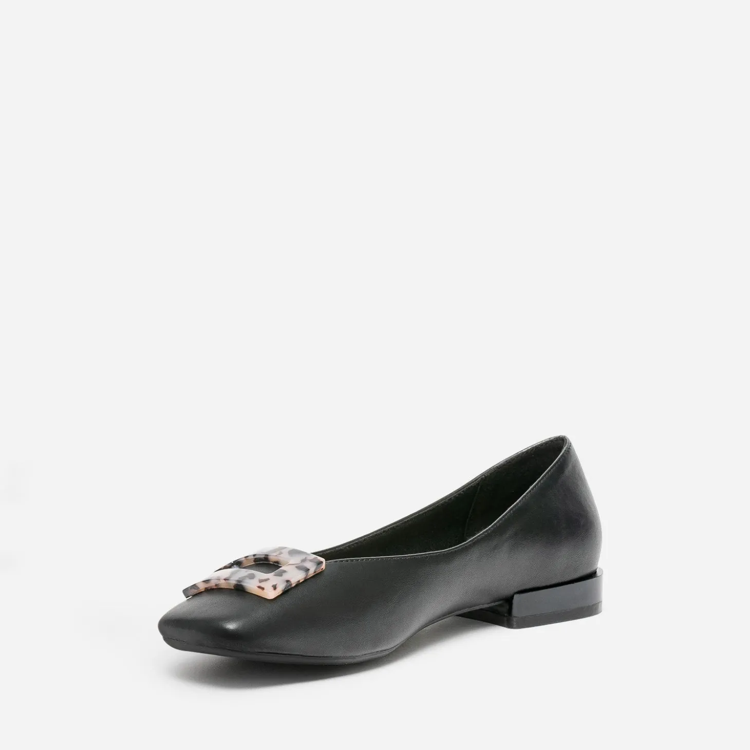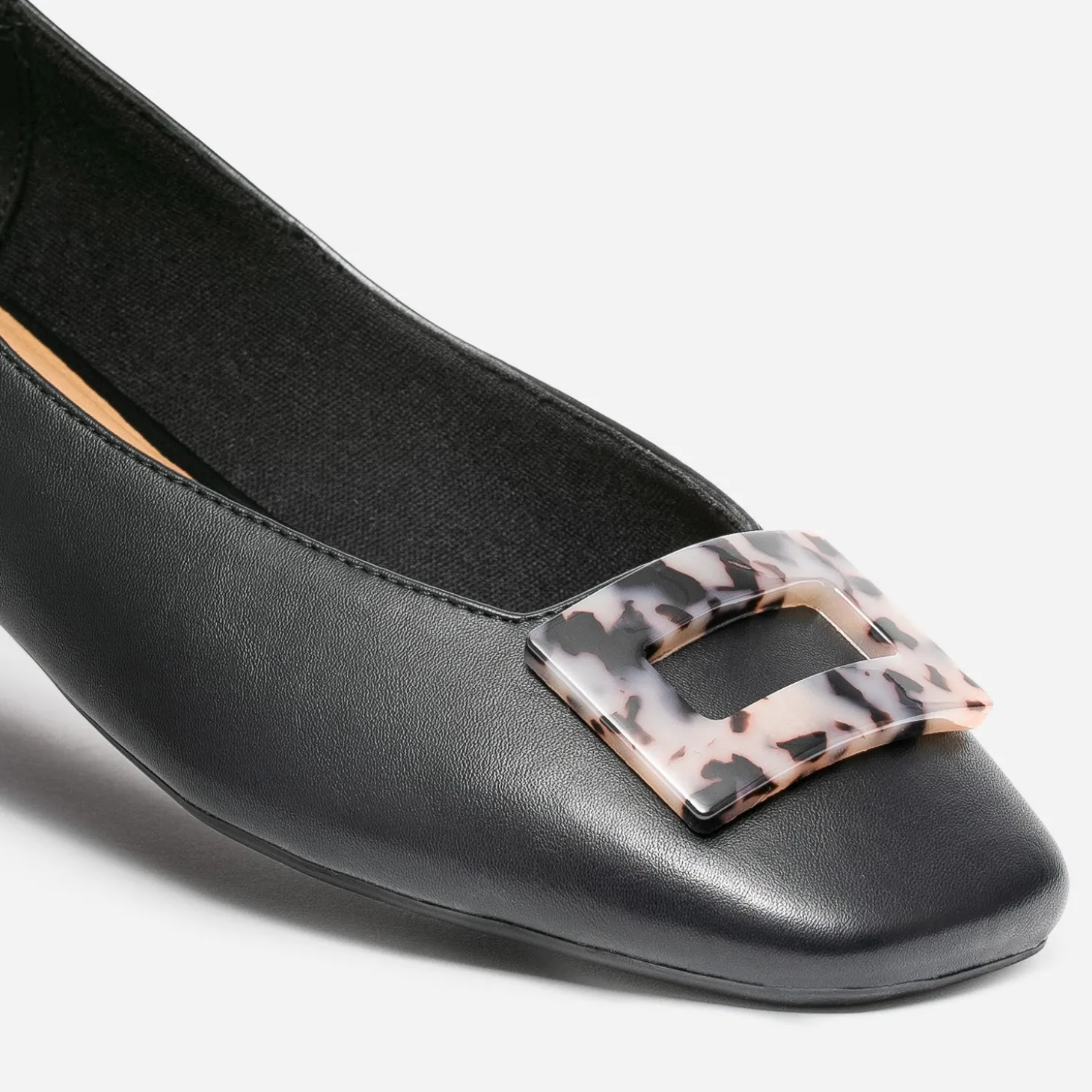 C’est confirmé : la ballerine fait son retour cette saison. En matière synthétique lisse noire, elle est montée sur un petit talon carré verni, qui fait écho au bout carré et au décor façon écaille posé sur le dessus du pied. Un esprit rétro, à décaler avec une chemise blanche, un jean mom cropped noir et des boucles d’oreilles massives en métal doré.