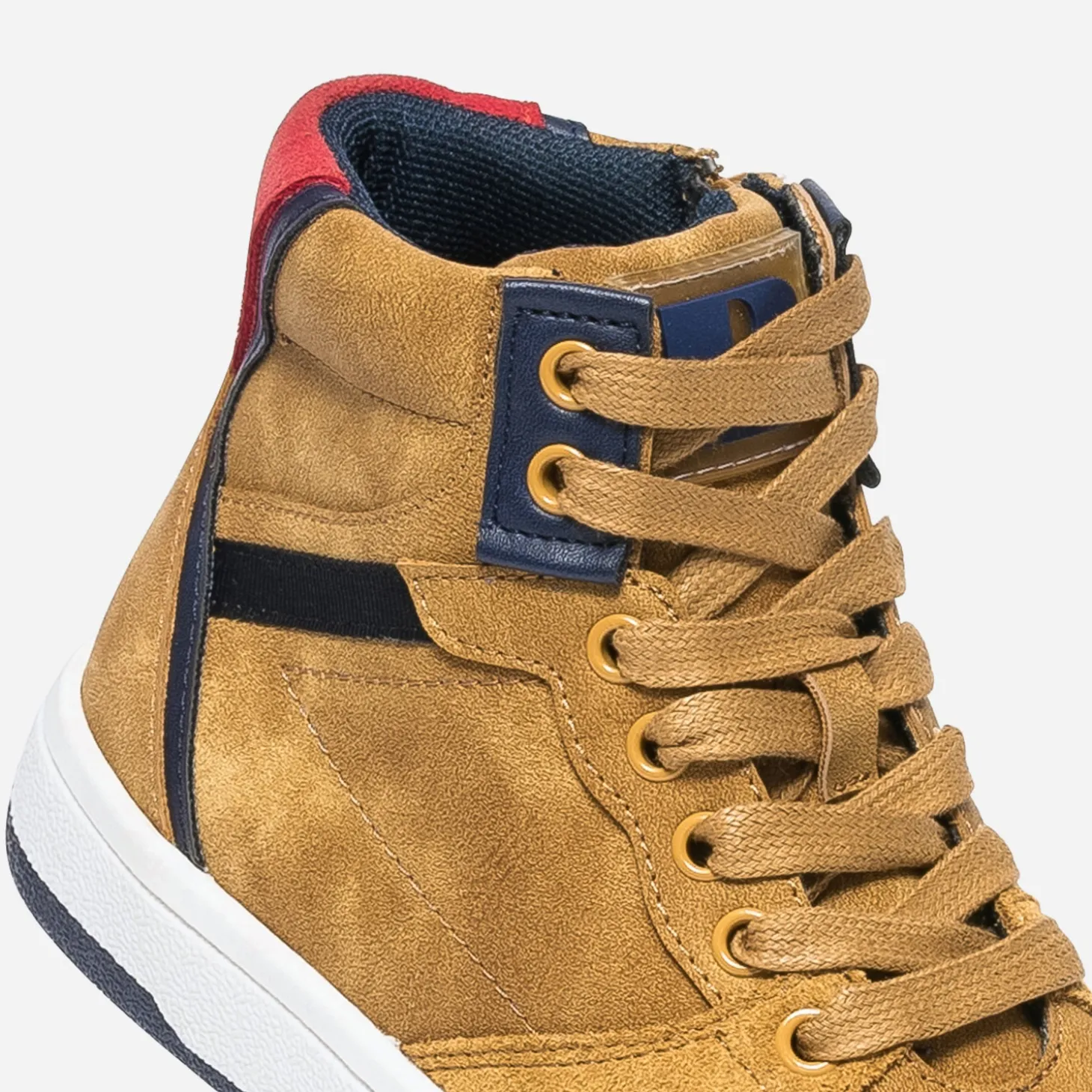Coup de cœur immédiat pour cette nouvelle basket pour garçon. Coloris camel, elle est conçue en matière synthétique suédée, rythmée, ici et là, de touches bleu marine et rouges. Le lacet est doublé d’un zip intérieur, pour ne pas perdre de temps à se chausser.