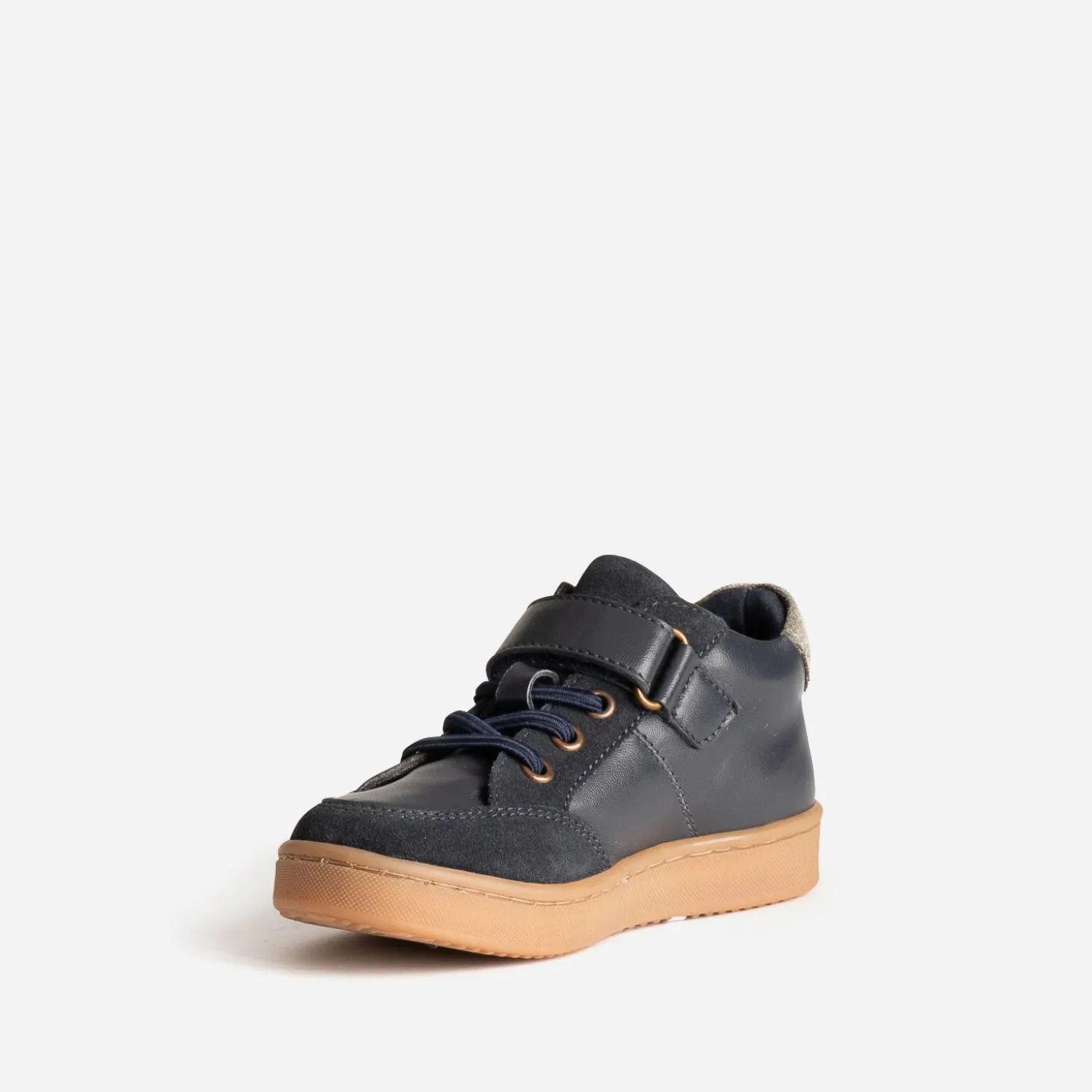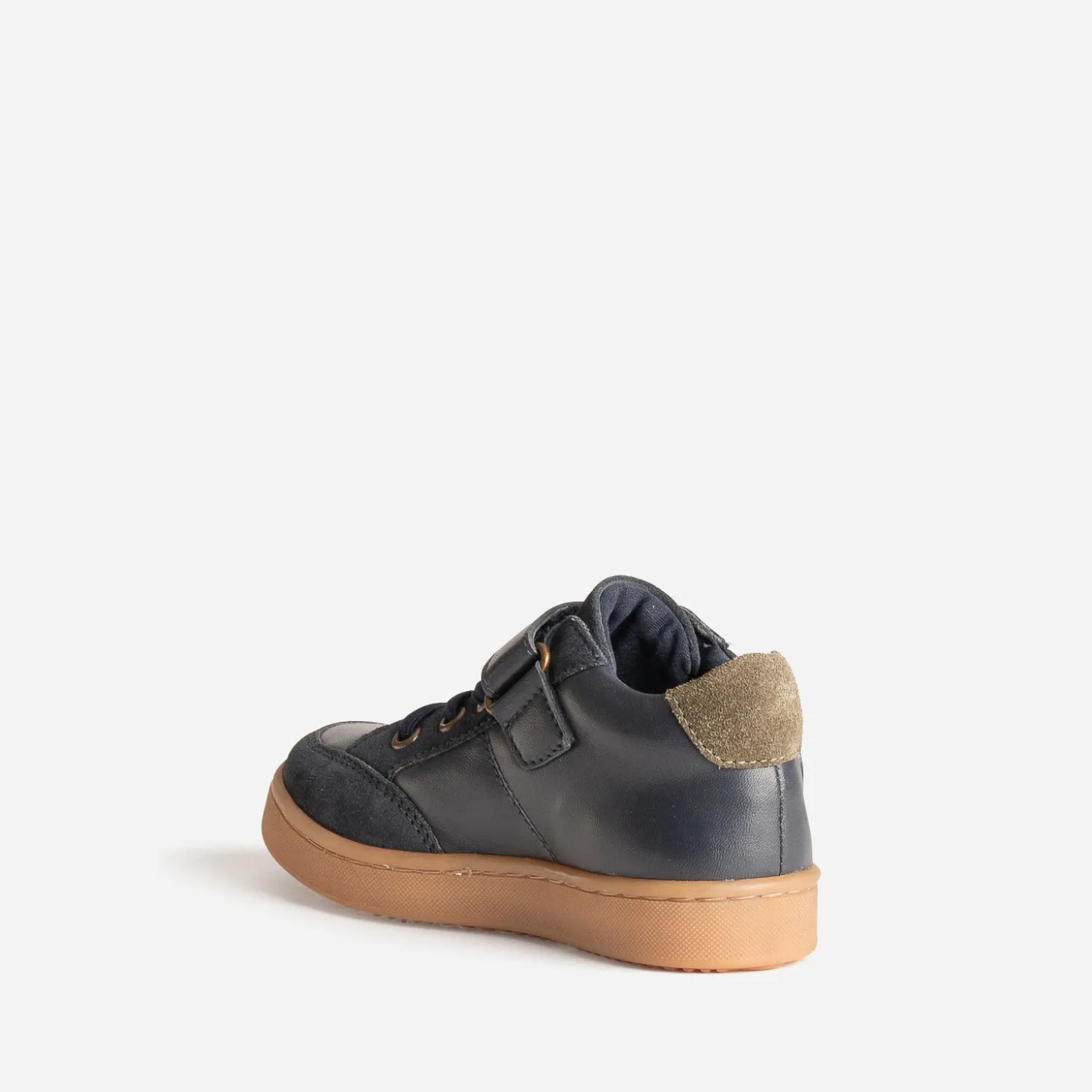 La basket en cuir confirme son statut de complice des enfants. Bleu marine, elle associe cuir lisse et cuir velours dans un bel équilibre. Semelle camel et empiècement kaki sur le contrefort apportent du style. La tige semi-montante maintient le pied par un lacet élastiqué et un scratch. Un modèle qui s’accorde facilement avec tous les looks du quotidien.
