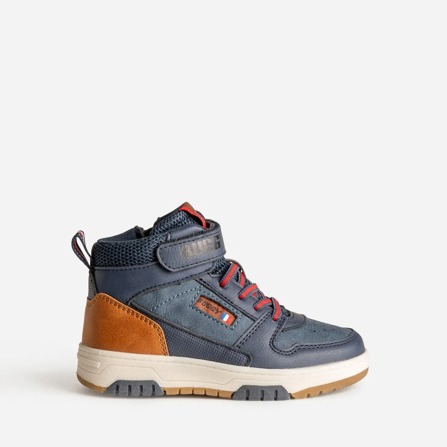 La basket connaît peu de concurrence quand il faut être confort et stylé. En matière synthétique bleu marine, elle multiplie les découpes et s’associe d’une part au mesh, d’autre part au camel et au rouge, pour affirmer son look. Lacet élastiqué, scratch et zip intérieur garantissent un maintien optimal du pied. Un modèle à porter avec un sweat à capuche oversize camel ou rouge sur un jean slim brut.