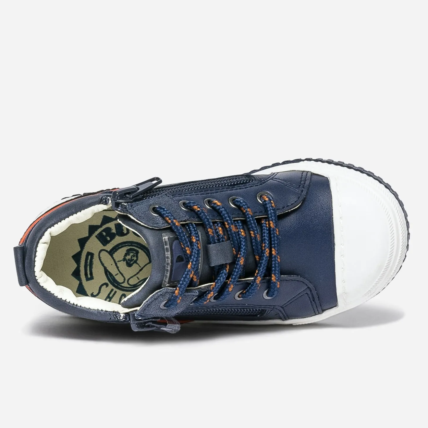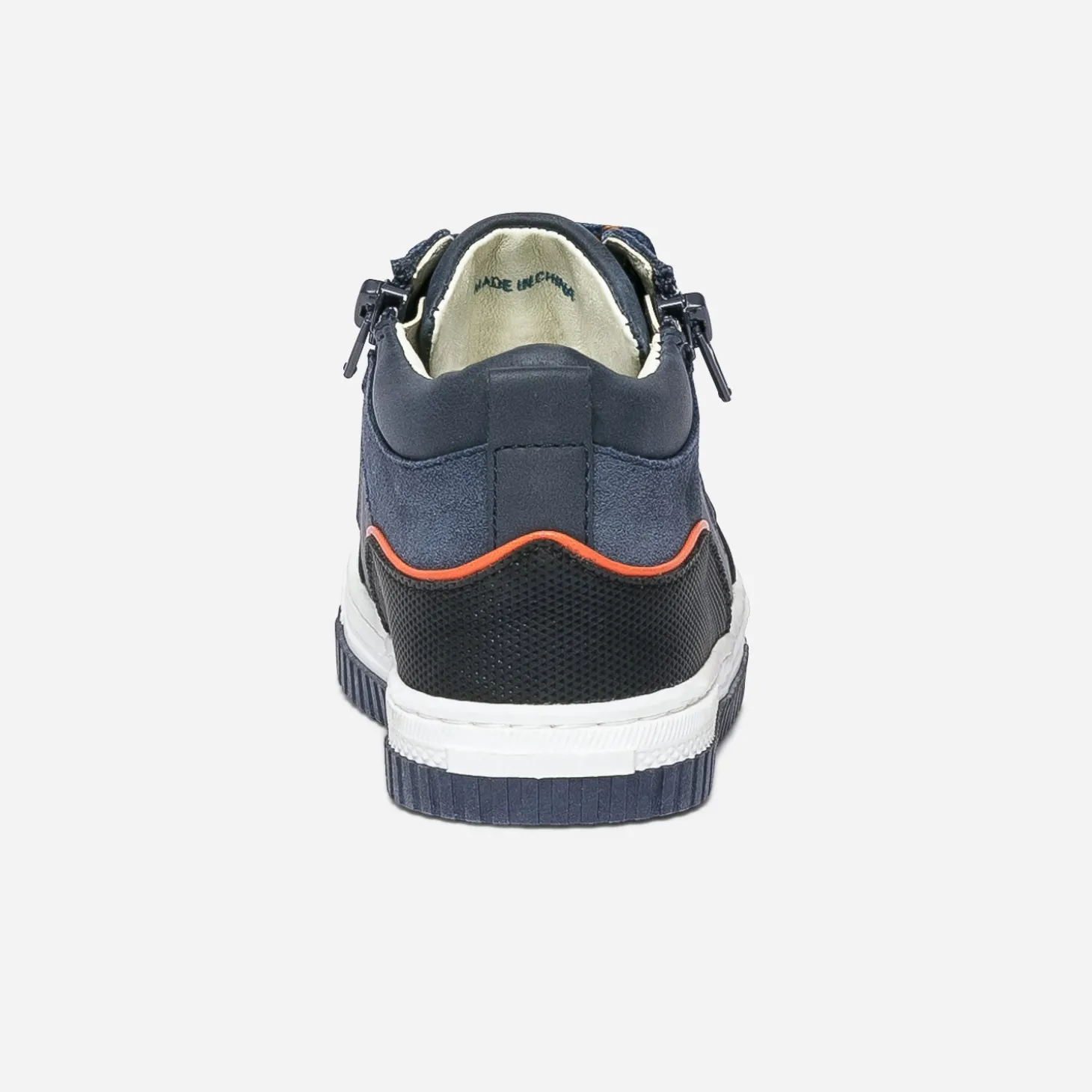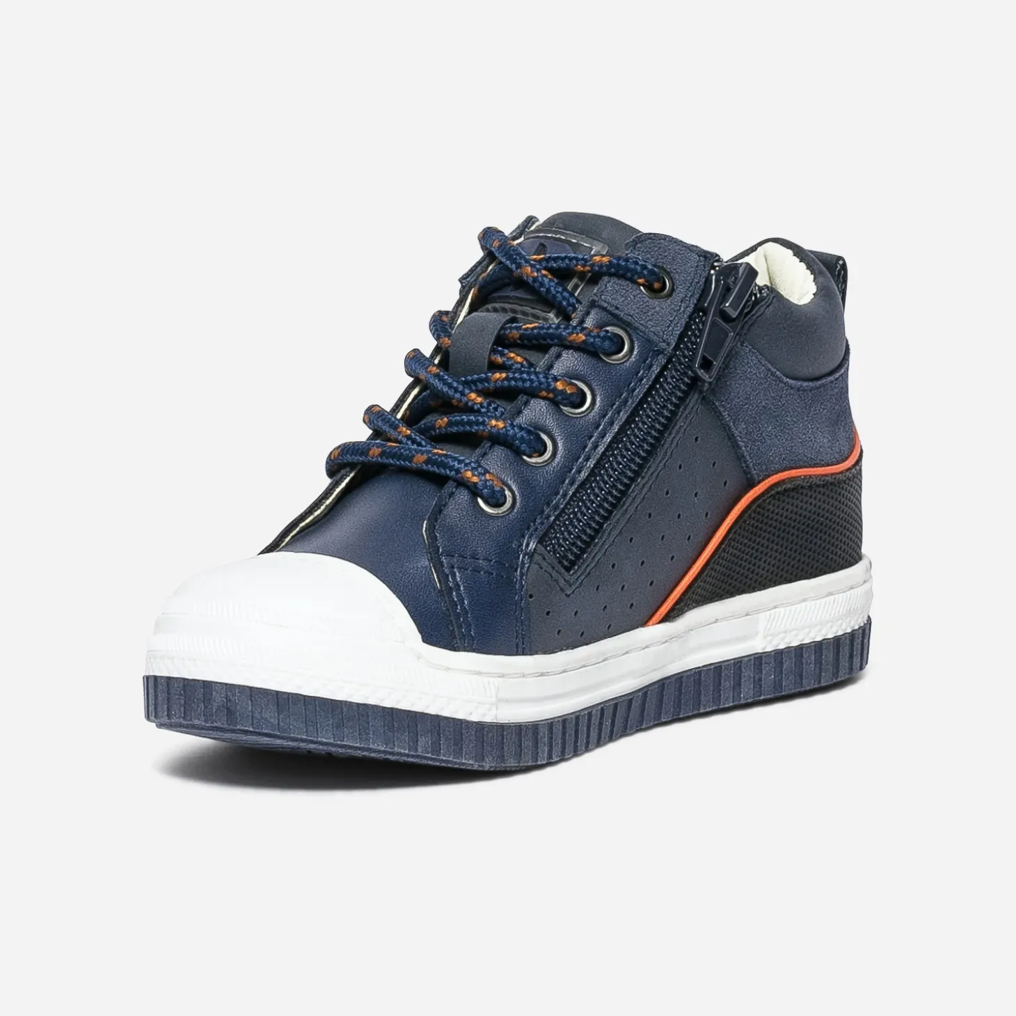 Marcher, courir, sauter, lancer le ballon. Cette basket mi-haute pour garçon est faite pour ça, rien que pour ça. Pour l’accompagner au quotidien, par une matière synthétique facile d’entretien, par un coloris bleu marine souligné d’orange, par un lacet et un double zip, pour simplifier l’entrée et la sortie du pied. Mix matières et bouts renforcés ajoutent une bonne note à l’originalité.