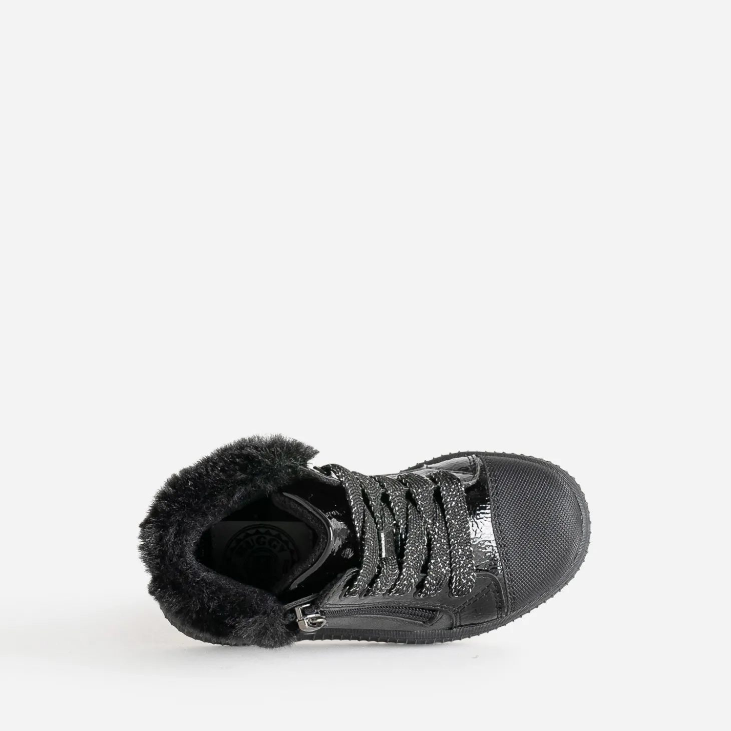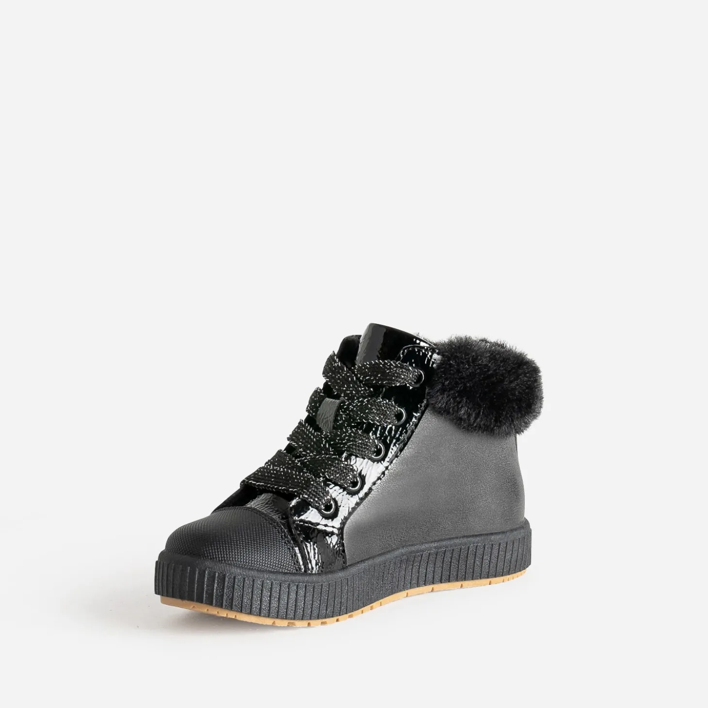 Affinez son style sporty rock, avec cette basket pour petite fille. En matières synthétiques noires, elle allie finitions mates et vernies, dans une belle harmonie. Cœurs sur le côté, bout renforcé, matière fourrée à la cheville : les détails sont particulièrement soignés. Elle se ferme par un lacet pailleté, doublé d’un zip latéral. Un modèle à jouer avec son jogging préféré, ou une robe-pull en molleton gris.