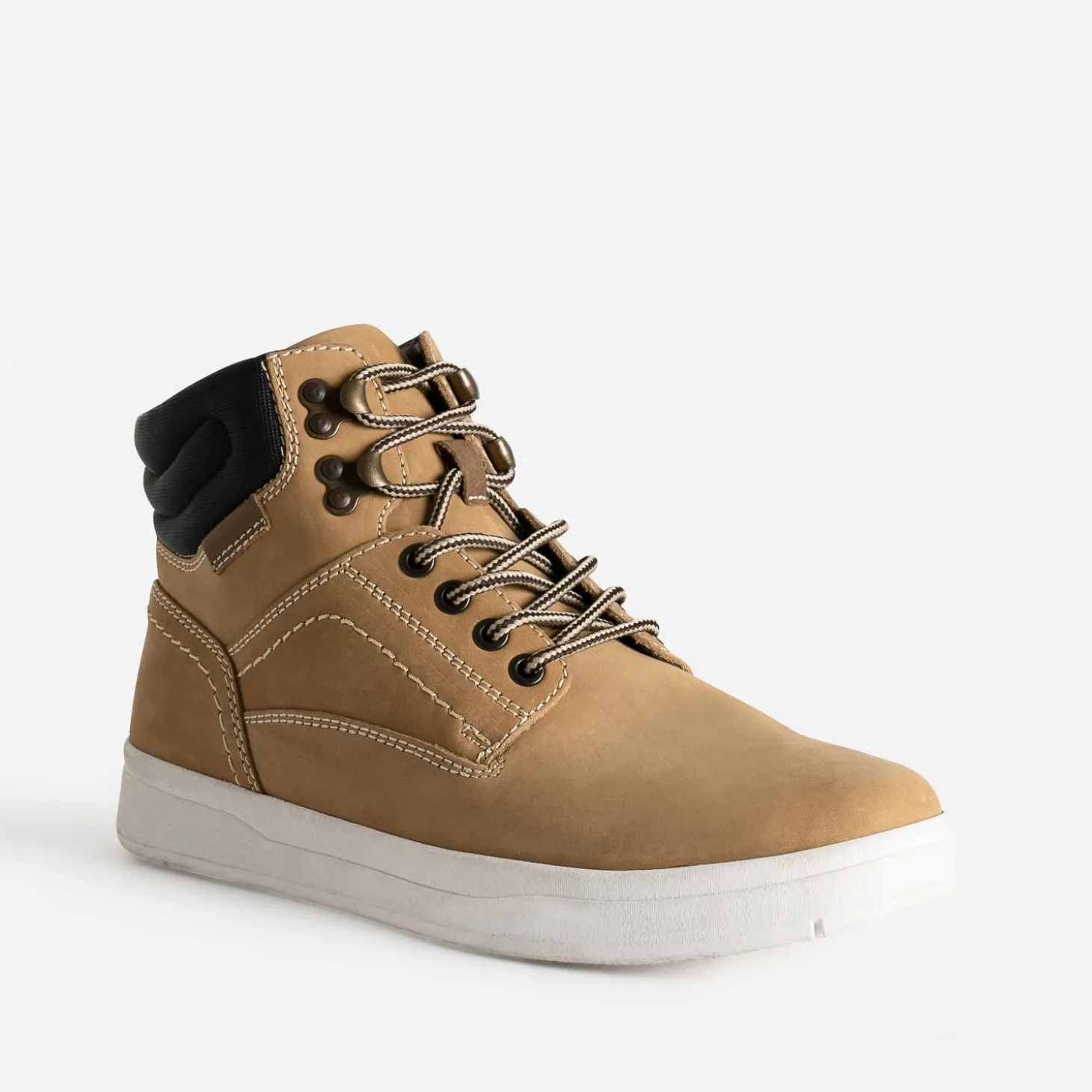 Inspiration workwear pour cette basket homme. Tige montante, col matelassé bi-matière, fermeture par lacet, elle est confectionnée en cuir nubuck camel, rehaussé de textile marron foncé. Le lacet rond s’inspire de l’esprit cordon. Un modèle à associer avec un total look en jean bleu ou gris.