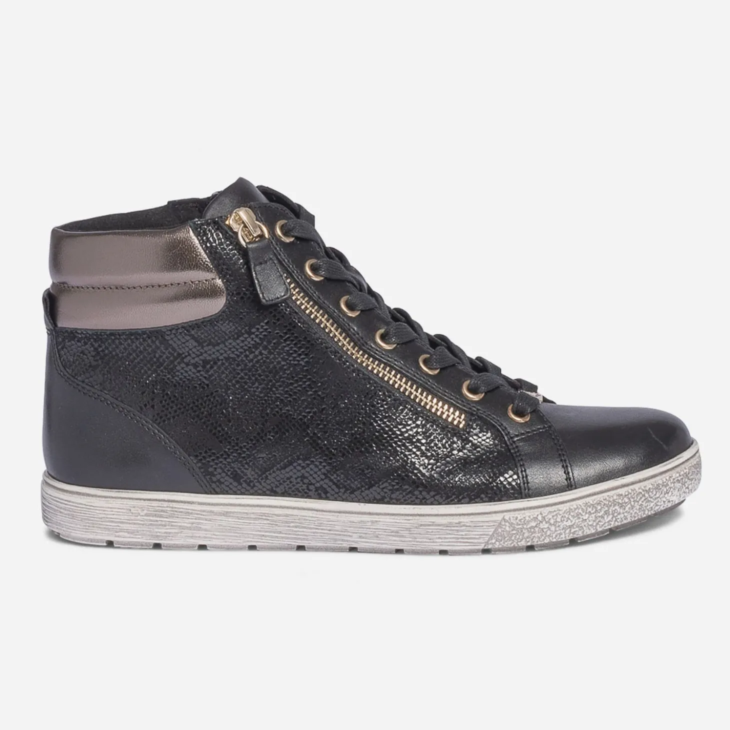 Spécialiste du bien-être, la marque CAPRICE propose des chaussures au confort incomparable. Cette nouvelle basket dévoile une ligne simple, associant laçage et double zip sur les côtés. Laissez-vous séduire par son cuir noir ultra souple, animé d’un imprimé effet python sur les quartiers et d’un effet métallisé bronze sur le hait de tige matelassé. La semelle première en cuir est dotée de la technologie ‘onAIR’, garantissant un meilleur amorti et une aération optimale de la chaussure.