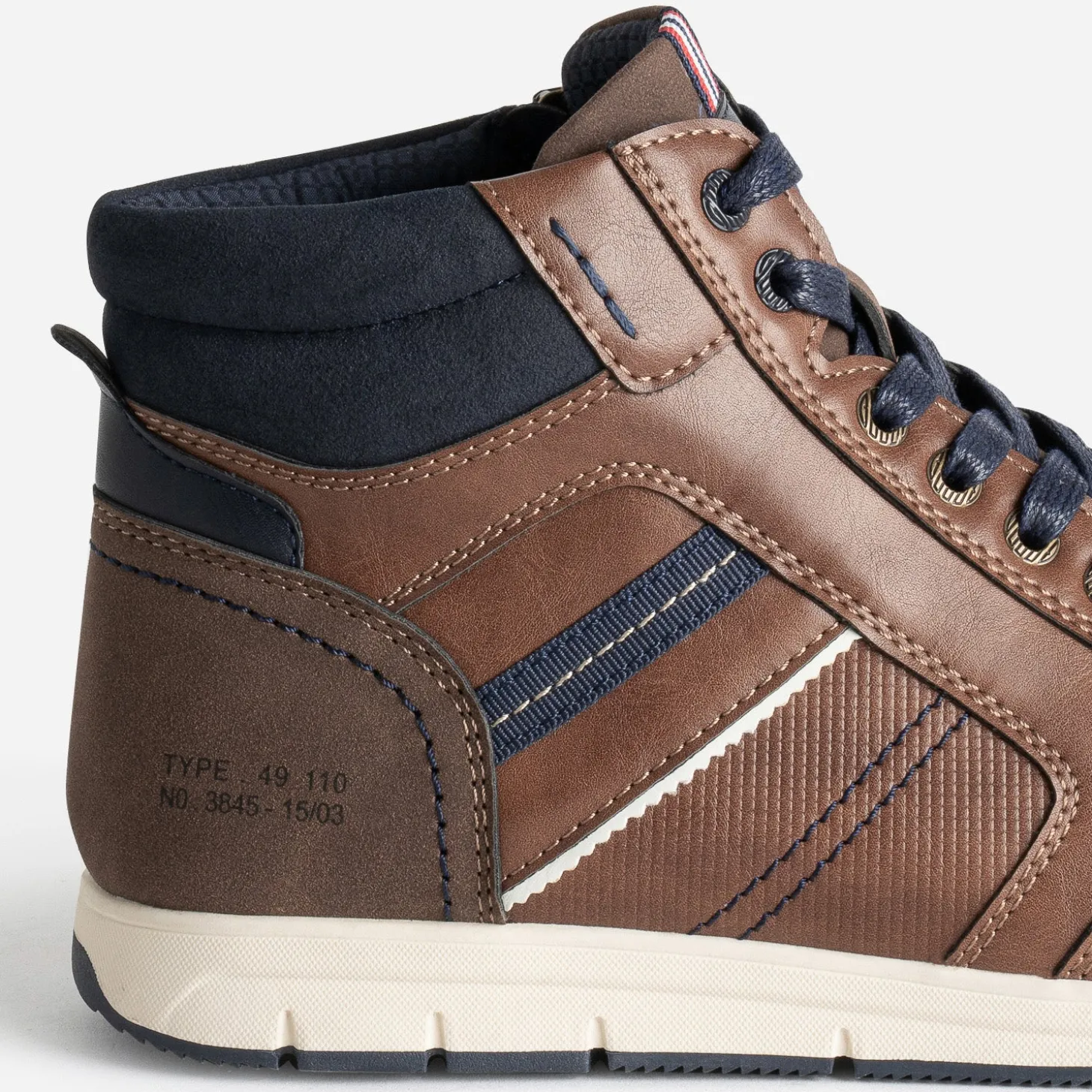Reconnaissable à sa tige montante, la basket a ses adeptes. En matière synthétique, elle associe le cognac, le bleu marine et le marron, dans un bel équilibre, soutenu par des découpes et des surpiqûres. La fermeture par lacet est complété par une fermeture par zip intérieur, pour faciliter l’entrée et la sortie du pied, et gagner ainsi quelques précieuses minutes sur sa journée. Un modèle, à préférer avec un look casual au quotidien, composé de pièces en jean dans des couleurs neutres.